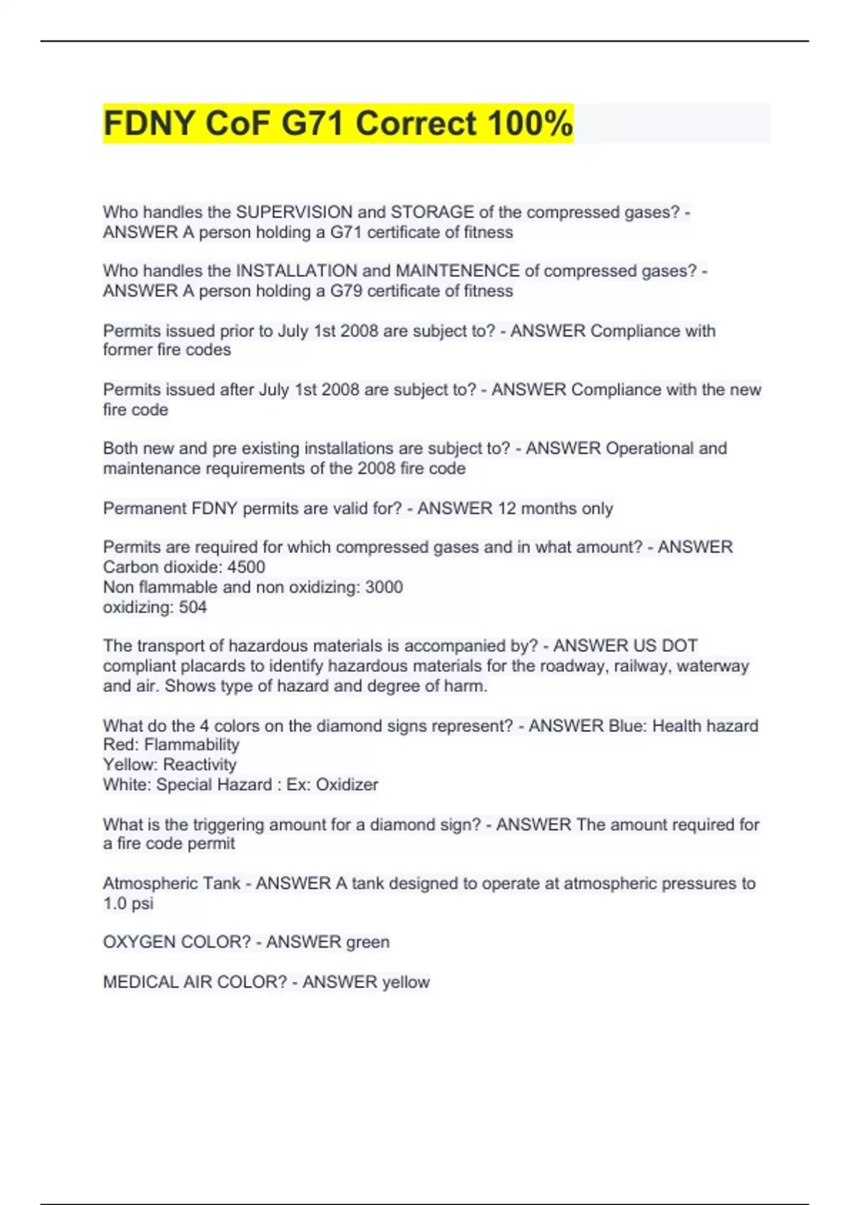 Who handles the SUPERVISION and STORAGE of the compressed gases? - ANSWER A person holding a G71 certificate of fitness Who handles the INSTALLATION and MAINTENENCE of compressed gases? - ANSWER A person holding a G79 certificate of fitness Permits issued prior to July 1st 2008 are subject to? - ANSWER Compliance with former fire codes Permits issued after July 1st 2008 are subject to? - ANSWER Compliance with the new fire code Both new and pre existing installations are subject to? - ANSWER Operational and maintenance requirements of the 2008 fire code Permanent FDNY permits are valid for? - ANSWER 12 months only Permits are required for which compressed gases and in what amount? - ANSWER Carbon dioxide: 4500 Non flammable and non oxidizing: 3000 oxidizing: 504 The transport of hazardous materials is accompanied by? - ANSWER US DOT compliant placards to identify hazardous materials for the roadway, railway, waterway and air. Shows type of hazard and degree of harm. What do the 4 colors on the diamond signs represent? - ANSWER Blue: Health hazard Red: Flammability Yellow: Reactivity White: Special Hazard : Ex: Oxidizer What is the triggering amount for a diamond sign? - ANSWER The amount required for a fire code permit Atmospheric Tank - ANSWER A tank designed to operate at atmospheric pressures to 1.0 psi OXYGEN COLOR? - ANSWER green MEDICAL AIR COLOR? - ANSWER yellow Nitrogen color? - ANSWER black Nitrous oxide color? - ANSWER blue Helium Color? - ANSWER Brown Carbon dioxide color? - ANSWER Grey Heliox - ANSWER Brown and green Emergency shutoff valvesshall be identified by - ANSWER A durable sign clearly visible near the valve ABSOLUTE ZERO - ANSWER Temperature at which all molecular motion, and consequently all life, ceases according to Einstein and the kinetic molecular theory. Absolute zero has never been reached, but it has been approached by the temperatures of some cryogenic gases ATMOSPHERIC TANK - ANSWER A storage tank designed to operate at pressures from atmospheric through 1.0 pound per square inch gauge measured at the top of the tank.