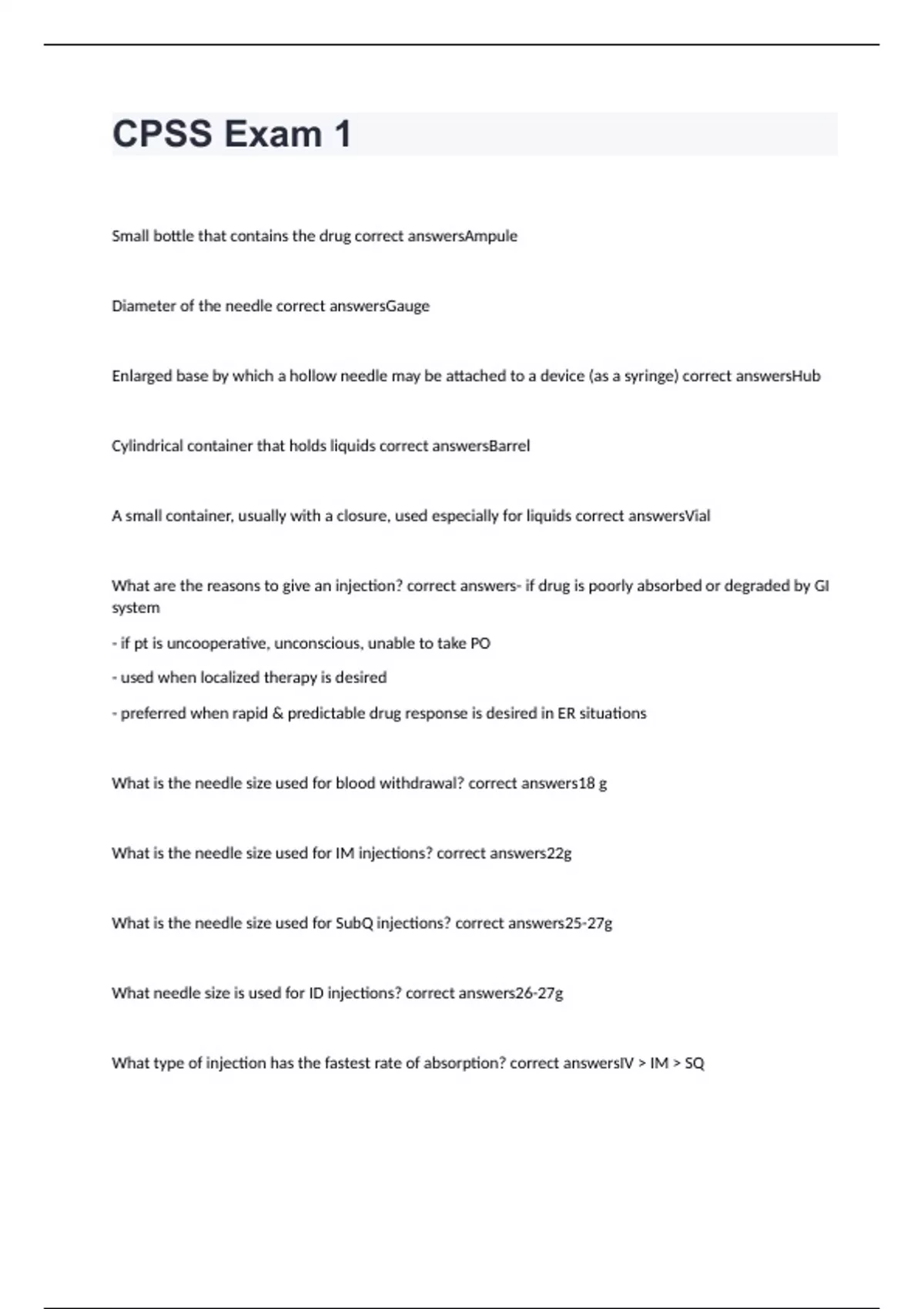 Small bottle that contains the drug correct answersAmpule Diameter of the needle correct answersGauge Enlarged base by which a hollow needle may be attached to a device (as a syringe) correct answersHub Cylindrical container that holds liquids correct answersBarrel A small container, usually with a closure, used especially for liquids correct answersVial What are the reasons to give an injection? correct answers- if drug is poorly absorbed or degraded by GI system - if pt is uncooperative, unconscious, unable to take PO - used when localized therapy is desired - preferred when rapid & predictable drug response is desired in ER situations What is the needle size used for blood withdrawal? correct answers18 g What is the needle size used for IM injections? correct answers22g What is the needle size used for SubQ injections? correct answers25-27g What needle size is used for ID injections? correct answers26-27g What type of injection has the fastest rate of absorption? correct answersIV IM SQ