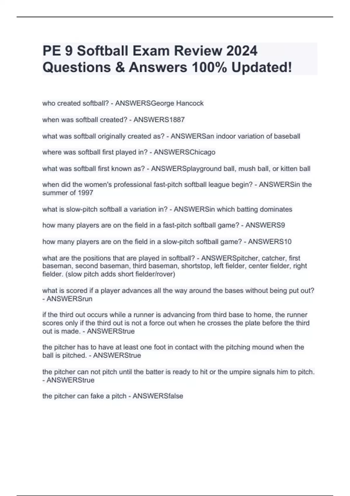 PE 9 Softball Exam Review 2024 Questions & Answers 100% Updated!