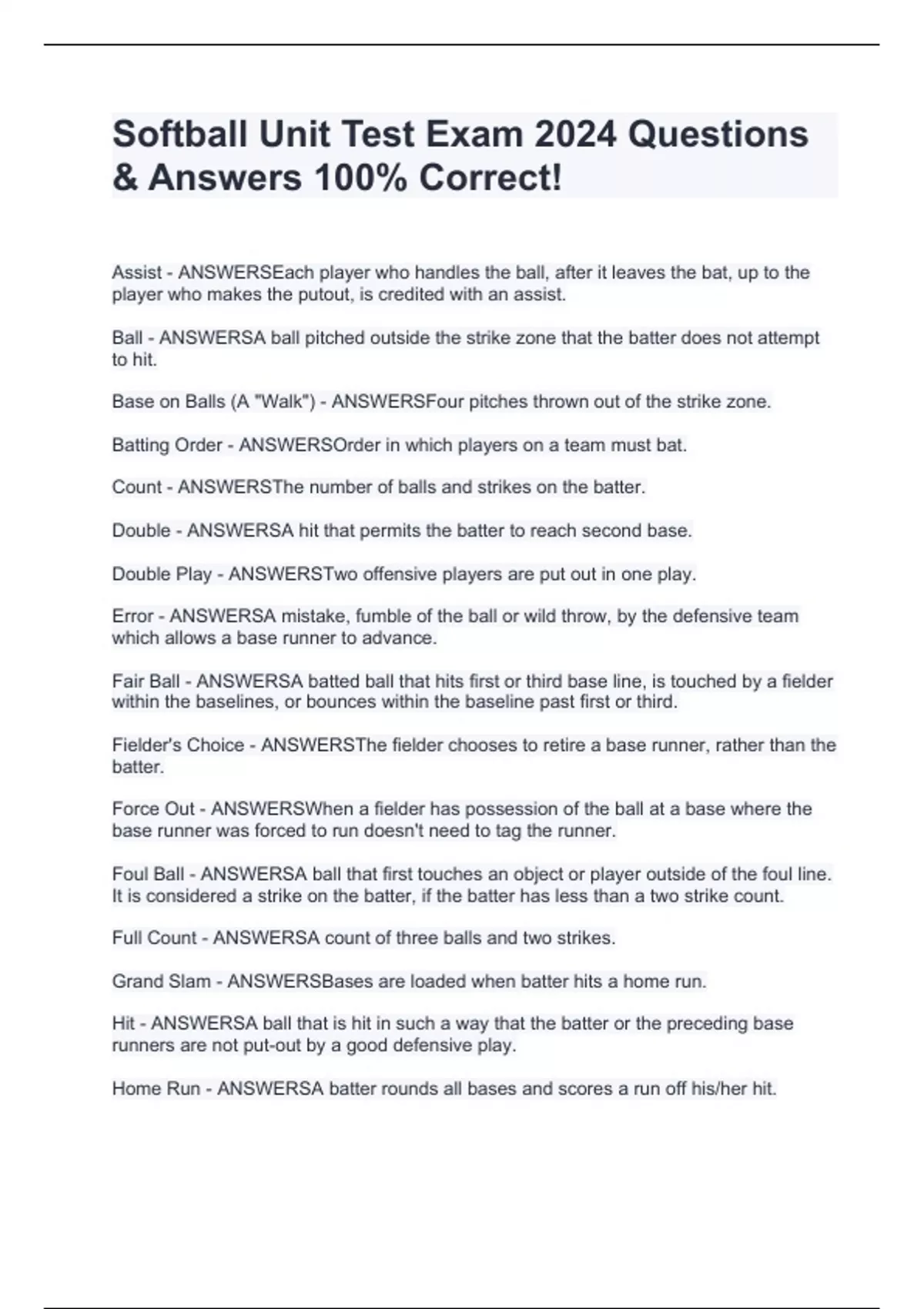 Softball Unit Test Exam 2024 Questions & Answers 100% Correct!