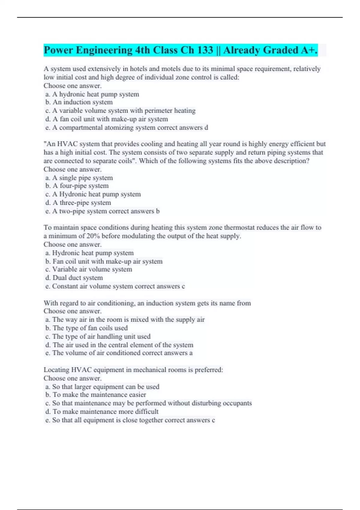 A system used extensively in hotels and motels due to its minimal space requirement, relatively low initial cost and high degree of individual zone control is called: Choose one answer. a. A hydronic heat pump system b. An induction system c. A variable volume system with perimeter heating d. A fan coil unit with make-up air system e. A compartmental atomizing system correct answers d "An HVAC system that provides cooling and heating all year round is highly energy efficient but has a high initial cost. The system consists of two separate supply and return piping systems that are connected to separate coils". Which of the following systems fits the above description? Choose one answer. a. A single pipe system b. A four-pipe system c. A Hydronic heat pump system d. A three-pipe system e. A two-pipe system correct answers b To maintain space conditions during heating this system zone thermostat reduces the air flow to a minimum of 20% before modulating the output of the heat supply. Choose one answer. a. Hydronic heat pump system b. Fan coil unit with make-up air system c. Variable air volume system d. Dual duct system e. Constant air volume system correct answers c With regard to air conditioning, an induction system gets its name from Choose one answer. a. The way air in the room is mixed with the supply air b. The type of fan coils used c. The type of air handling unit used d. The air used in the central element of the system e. The volume of air conditioned correct answers a Locating HVAC equipment in mechanical rooms is preferred: Choose one answer. a. So that larger equipment can be used b. To make the maintenance easier c. So that maintenance may be performed without disturbing occupants d. To make maintenance more difficult e. So that all equipment is close together correct answers c