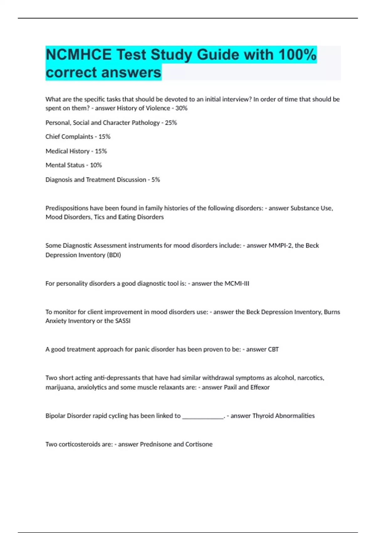 What are the specific tasks that should be devoted to an initial interview? In order of time that should be spent on them? History of Violence - 30% Personal, Social and Character Pathology - 25% Chief Complaints - 15% Medical History - 15% Mental Status - 10% Diagnosis and Treatment Discussion - 5% Predispositions have been found in family histories of the following disorders: Substance Use, Mood Disorders, Tics and Eating Disorders Some Diagnostic Assessment instruments for mood disorders include: MMPI-2, the Beck Depression Inventory (BDI) For personality disorders a good diagnostic tool is: the MCMI-III To monitor for client improvement in mood disorders use: the Beck Depression Inventory, Burns Anxiety Inventory or the SASSI A good treatment approach for panic disorder has been proven to be: CBT Two short acting anti-depressants that have had similar withdrawal symptoms as alcohol, narcotics, marijuana, anxiolytics and some muscle relaxants are: Paxil and Effexor Bipolar Disorder rapid cycling has been linked to ____________. Thyroid Abnormalities Two corticosteroids are: Prednisone and Cortisone Corticosteroids can can cause what symptoms/disorders? Can cause changes in mood and cognition, are generally dose related and can precipitate psychosis, hypomania, depression, cognitive and memory problems. Interferon (treatment for Hep C) has caused what disorder in 23% of patients? Depression Cold meds can cause atropine. What is atropine? confusion, disorientation, agitation, hallucinations, and memory problems. Acne medicine (Isotrentinoin) can cause severe.... depression and suicidal behavior. Cormorbid traits of Tourette's Syndrome. Relatives of clients with Tourette's have a higher incidence of tics, OCD and ADHD. Some disorders that have family predispositions are: Tourette's, Eating Disorders, Tics, Alcoholism, ADHD The top scales used in mental health are: MMPI-2, Wechsler Adult Intelligence Scale -R, Bender Gestalt, Sentence Completion. The top scales used with adolescents are: Wechsler Intelligence Scales, Rorschach Ink Blot Test, Bender Gestalt, Sentence Completion What is the NEPSY-II? Neuropsychology II assesses brain development in ages 3-16. Helps ID academic, social and behavioral difficulties, ADHD, PDD/autism spectrum disorder, language disorder, mathematics disorder and reading disorder. NOTE: prior to administering the NEPSY-II gather data on their lives, medical risk factors, demands placed on child at home What is the Bender Gestalt II? It measures visual motor behavior in ages 4-85. What is the MCMII-III? The Millon Clinical Multiaxial Inventory measures personality traits and psychopathology. Helps ID schizoid personality, avoidant personality, depressive personality, dependent personality, histrionic personality, narcissistic personality, antisocial personality, sadistic personality (aggressive), compulsive personality, negativistic personality (passive-aggressive), self-defeating personality (masochistic). AS WELL as schizotypal, borderline and paranoid. BDI-II Beck Depression Inventory can be used in diagnosing panic disorder, schizophrenia and mood disorders. What is the SCLR-90? Gives PRESUMPTIVE OR IMPRESSIONISTIC MARKERS about the characteristics of a disease or condition. It is used with people with eating disorders (bulimic), anxiety or depressive disorders, stress, suicidal behavior, somatization, interpersonal sensitivity, paranoid ideation, psychoticism, sleep disorders, AOD abuse, physical or sexual abuse and sexual dysfunction and sensitivity to drug vs. placebo. SASSI-3 Self report and screens for substance dependent disorder SCID-I and SCID-II A set of questions to be used in conjunction with the bipolar spectrum diagnostic scale. Measures mood episodes, psychotic symptoms and disorders, mood disorders, substance use disorders, anxiety, adjustment disorders. BSDS Bipolar Spectrum Diagnostic Scale - identifies presence or absence of bipolar disorder. MDQ Mood Disorder Questionnaire - easy SCREENING tool for detecting bipolar I or disorder. NOTE: It is NOT used for monitoring for improvement. DAST and SMAST Drug Abuse Screening Test (for drugs) and Short Michigan Alcoholism Test (for people with drinking problems) DES Dissociative Experiences Scale is used in tandem with the SCID-D (for dissociative disorders WISC-IV and WPPSI-III Wechsler Intelligence Scales for ages 6-16, the WPPSI is for age 2.5-7. CDI Children's Depression Inventory is FOR PARENTS about their children for ages 7-17. RCMAS-2 Revised Children's Manifest Anxiety Scale - most widely used questionnaire assesses type and level of anxiety in ages 6-19. Achenback system of Emprically Based Assessment (ASEBA) for ages 6-18 measures aff