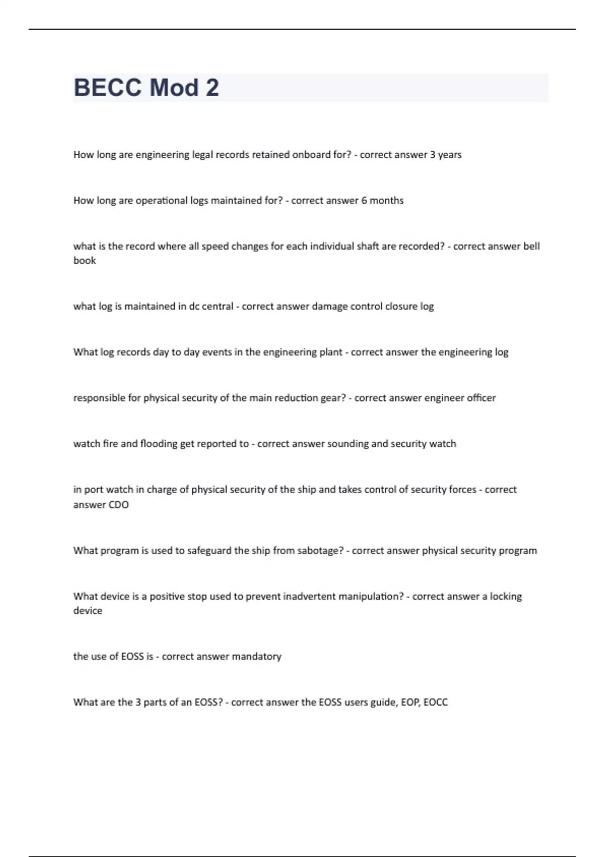 BECC Mod 2 Correctly Answered Questions 2024. How long are engineering legal records retained onboard for? - correct answer 3 years How long are operational logs maintained for? - correct answer 6 months what is the record where all speed changes for each individual shaft are recorded? - correct answer bell book what log is maintained in dc central - correct answer damage control closure log What log records day to day events in the engineering plant - correct answer the engineering log responsible for physical security of the main reduction gear? - correct answer engineer officer watch fire and flooding get reported to - correct answer sounding and security watch in port watch in charge of physical security of the ship and takes control of security forces - correct answer CDO What program is used to safeguard the ship from sabotage? - correct answer physical security program What device is a positive stop used to prevent inadvertent manipulation? - correct answer a locking device the use of EOSS is - correct answer mandatory
