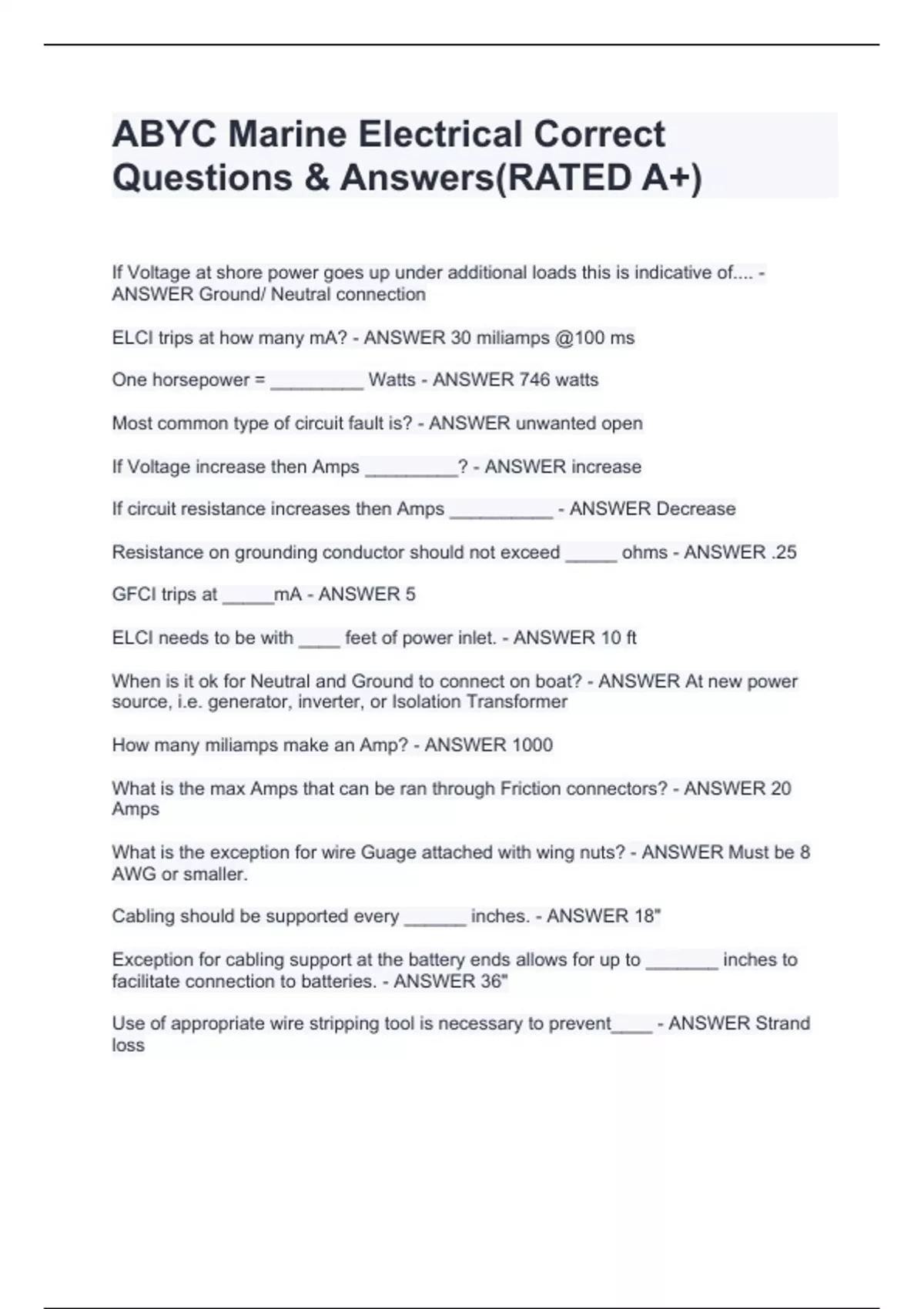 If Voltage at shore power goes up under additional loads this is indicative of.... - ANSWER Ground/ Neutral connection ELCI trips at how many mA? - ANSWER 30 miliamps @100 ms One horsepower = _________ Watts - ANSWER 746 watts Most common type of circuit fault is? - ANSWER unwanted open If Voltage increase then Amps _________? - ANSWER increase If circuit resistance increases then Amps __________ - ANSWER Decrease Resistance on grounding conductor should not exceed _____ ohms - ANSWER .25 GFCI trips at _____mA - ANSWER 5 ELCI needs to be with ____ feet of power inlet. - ANSWER 10 ft When is it ok for Neutral and Ground to connect on boat? - ANSWER At new power source, i.e. generator, inverter, or Isolation Transformer How many miliamps make an Amp? - ANSWER ELCI trips at how many mA? - ANSWER 30 miliamps @100 ms ELCI trips at how many mA? - ANSWER 30 miliamps @100 ms