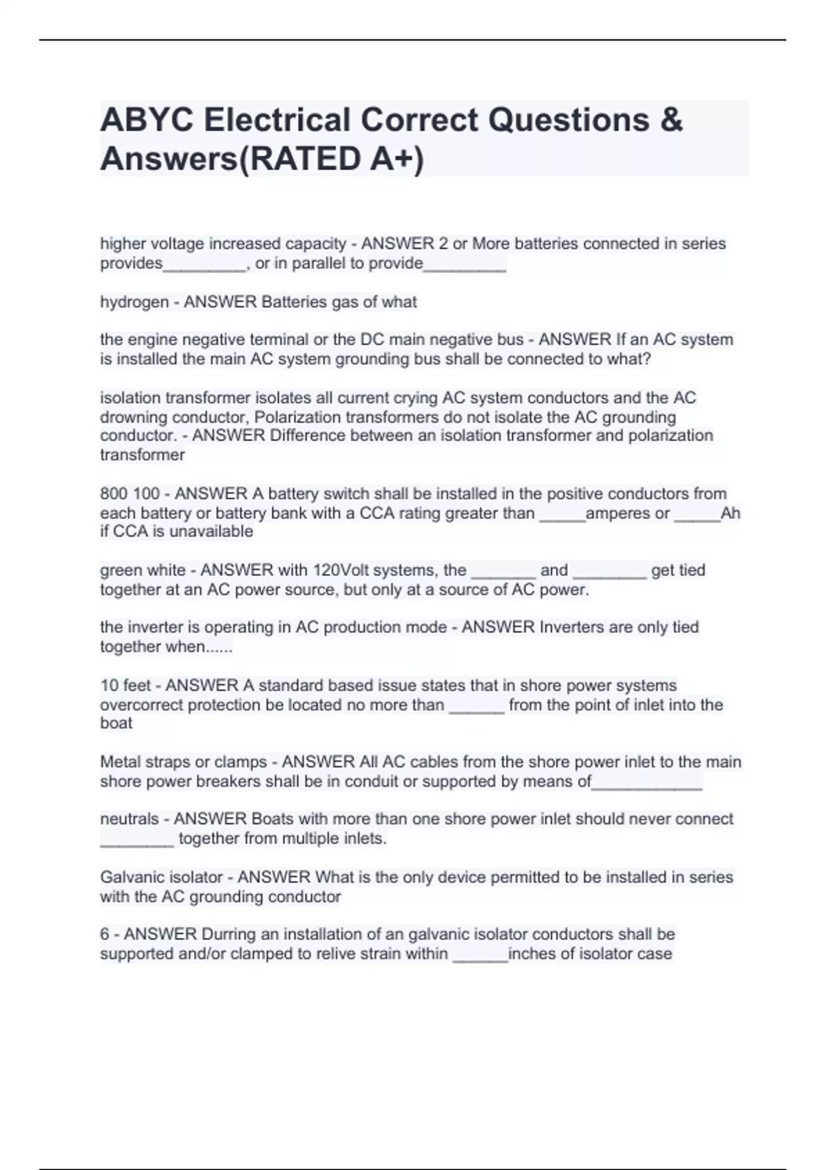 higher voltage increased capacity - ANSWER 2 or More batteries connected in series provides_________, or in parallel to provide_________ hydrogen - ANSWER Batteries gas of what the engine negative terminal or the DC main negative bus - ANSWER If an AC system is installed the main AC system grounding bus shall be connected to what? isolation transformer isolates all current crying AC system conductors and the AC drowning conductor, Polarization transformers do not isolate the AC grounding conductor. - ANSWER Difference between an isolation transformer and polarization transformer 800 100 - ANSWER A battery switch shall be installed in the positive conductors from each battery or battery bank with a CCA rating greater than _____amperes or _____Ah if CCA is unavailable green white - ANSWER with 120Volt systems, the _______ and ________ get tied together at an AC power source, but only at a source of AC power. the inverter is operating in AC production mode - ANSWER Inverters are only tied together when...... 10 feet - ANSWER A standard based issue states that in shore power systems overcorrect protection be located no more than ______ from the point of inlet into the boat Metal straps or clamps - ANSWER All AC cables from the shore power inlet to the main shore power breakers shall be in conduit or supported by means of____________ neutrals - ANSWER Boats with more than one shore power inlet should never connect ________ together from multiple inlets. Galvanic isolator - ANSWER What is the only device permitted to be installed in series with the AC grounding conductor 6 - ANSWER Durring an installation of an galvanic isolator conductors shall be supported and/or clamped to relive strain within ______inches of isolator case 135 - ANSWER The galvanic isolator shall be provided with wiring terminals or wire leads for connection, having an ampacity that is __________ percent of its nominal rating.