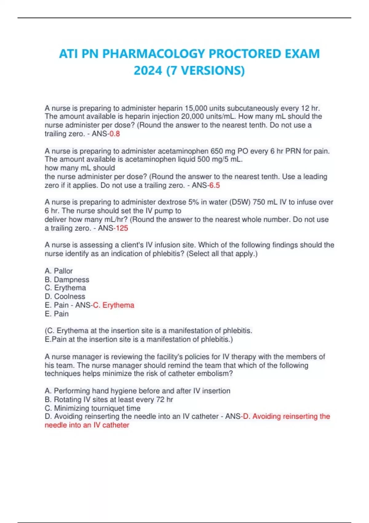 ATI PN PHARMACOLOGY PROCTORED EXAM 2024 (7 VERSIONS) A nurse is preparing to administer heparin 15,000 units subcutaneously every 12 hr. The amount available is heparin injection 20,000 units/mL. How many mL should the nurse administer per dose? (Round the answer to the nearest tenth. Do not use a trailing zero. - ANS-0.8 A nurse is preparing to administer acetaminophen 650 mg PO every 6 hr PRN for pain. The amount available is acetaminophen liquid 500 mg/5 mL. how many mL should the nurse administer per dose? (Round the answer to the nearest tenth. Use a leading zero if it applies. Do not use a trailing zero. - ANS-6.5 A nurse is preparing to administer dextrose 5% in water (D5W) 750 mL IV to infuse over 6 hr. The nurse should set the IV pump to deliver how many mL/hr? (Round the answer to the nearest whole number. Do not use a trailing zero. - ANS-125 A nurse is assessing a client's IV infusion site. Which of the following findings should the nurse identify as an indication of phlebitis? (Select all that apply.) A. Pallor B. Dampness C. Erythema D. Coolness E. Pain - ANS-C. Erythema E. Pain (C. Erythema at the insertion site is a manifestation of phlebitis. E.Pain at the insertion site is a manifestation of phlebitis.) A nurse manager is reviewing the facility's policies for IV therapy with the members of his team. The nurse manager should remind the team that which of the following techniques helps minimize the risk of catheter embolism? A. Performing hand hygiene before and after IV insertion B. Rotating IV sites at least every 72 hr C. Minimizing tourniquet time D. Avoiding reinserting the needle into an IV catheter - ANS-D. Avoiding reinserting the needle into an IV catheter (The nurse manager should remind the members of the team to avoid reinserting the stylet needle into an IV catheter. This action can result in severing the end of the catheter and consequently cause a catheter embolism) A nurse is preparing to initiate IV therapy for an older adult client. Which of the following actions should the nurse plan to take? A provider prescribes phenobarbital for a client who has a seizure disorder. The medication has a long half-life of 4 days. How many times per day should the nurse expect to administer this medication? A. One B. Two C. Three D. Four - ANS-A. One (Medications with long half-lives remain at their therapeutic levels between doses for long periods of time. The nurse should expect to administer this medication once a day.) A staff educator is reviewing medication dosages and factors that influence medication metabolism with a group of nurses at an in-service presentation. Which of the following factors should the educator include as a reason to administer lower medication dosages? (Select all that apply.) A. Increased renal secretion B. Increased medication-metabolizing enzymes C. Liver failure D. Peripheral vascular disease E. Concurrent use of medication the same pathway metabolizes - ANS-C. Liver failure E. Concurrent use of medication the same pathway metabolizes C. Liver failure decreases metabolism and thus increases the concentration of a medication. This requires decreasing the dosage. E. When the same pathway metabolizes two medications, they compete for metabolism, thereby increasing the concentration of one or both medications. This requires decreasing the dosage of one or both A nurse is preparing to administer eye drops to a client. Which of the following actions should the nurse take? (Select all that apply.) A. Have the client lie on her side. B. Ask the client to look up at the ceiling. C. Tell the client to blink when the drops enter her eye. D. Drop the medication into the center of the client's conjunctival sac. E. Instruct the client to close her eye gently after instillation - ANS-B. Ask the client to look up at the ceiling. D. Drop the medication into the center of the client's conjunctival sac. E. Instruct the client to close her eye gently after instillation (B. The client should look upward to keep the drops from falling onto her cornea. D. The nurse should drop the medication into the center of the conjunctival sac to promote distribution. E. The client should close her eye gently to promote distribution of the medication) A nurse is completing discharge teaching for a client who has a new prescription for transdermal patches. Which of the following statements should the nurse identify as an indication that the client understands the instructions? A. "I will clean the site with an alcohol swab before I apply the patch." B. "I will rotate the application sites weekly." C. "I will apply the patch to an area of skin with no hair." D. "I will place the new patch on the site of the old patch. - ANS-C. "I will apply the patch to an area of skin with no hair." (The client should apply the patch to a hairless area of skin to promote absorption of the medication.) A nurse reviewing a client's medical record notes a new prescription for verifying the trough level of the client's medication. Which of the following actions should the nurse take