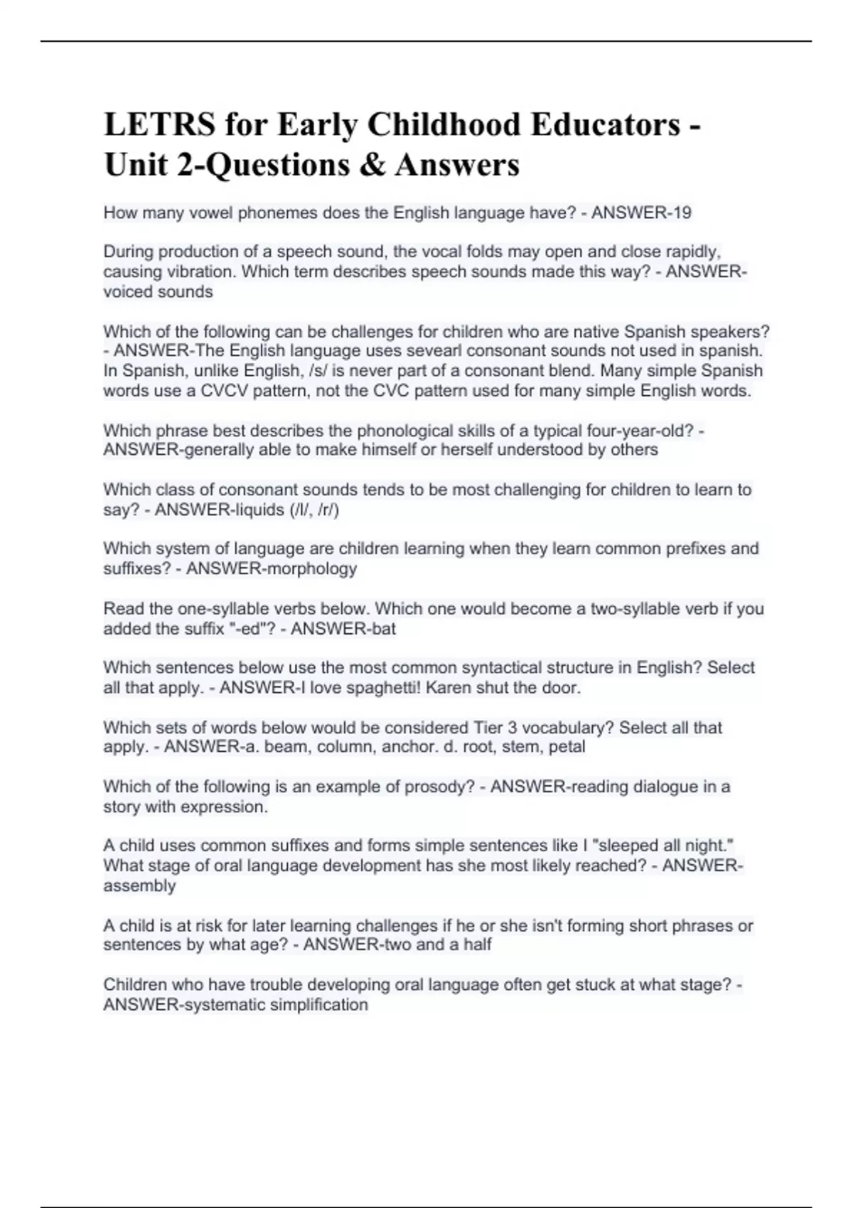 LETRS for Early Childhood Educators - Unit 2-Questions & Answers How many vowel phonemes does the English language have? - ANSWER-19 During production of a speech sound, the vocal folds may open and close rapidly, causing vibration. Which term describes speech sounds made this way? - ANSWER-voiced sounds Which of the following can be challenges for children who are native Spanish speakers? - ANSWER-The English language uses sevearl consonant sounds not used in spanish. In Spanish, unlike English, /s/ is never part of a consonant blend. Many simple Spanish words use a CVCV pattern, not the CVC pattern used for many simple English words. Which phrase best describes the phonological skills of a typical four-year-old? - ANSWER-generally able to make himself or herself understood by others Which class of consonant sounds tends to be most challenging for children to learn to say? - ANSWER-liquids (/l/, /r/) Which system of language are children learning when they learn common prefixes and suffixes? - ANSWER-morphology Read the one-syllable verbs below. Which one would become a two-syllable verb if you added the suffix "-ed"? - ANSWER-bat Which sentences below use the most common syntactical structure in English? Select all that apply. - ANSWER-I love spaghetti! Karen shut the door. Which sets of words below would be considered Tier 3 vocabulary? Select all that apply. - ANSWER-a. beam, column, anchor. d. root, stem, petal Which of the following is an example of prosody? - ANSWER-reading dialogue in a story with expression. A child uses common suffixes and forms simple sentences like I "sleeped all night." What stage of oral language development has she most likely reached? - ANSWER-assembly A child is at risk for later learning challenges if he or she isn't forming short phrases or sentences by what age? - ANSWER-two and a half Children who have trouble developing oral language often get stuck at what stage? - ANSWER-systematic simplification