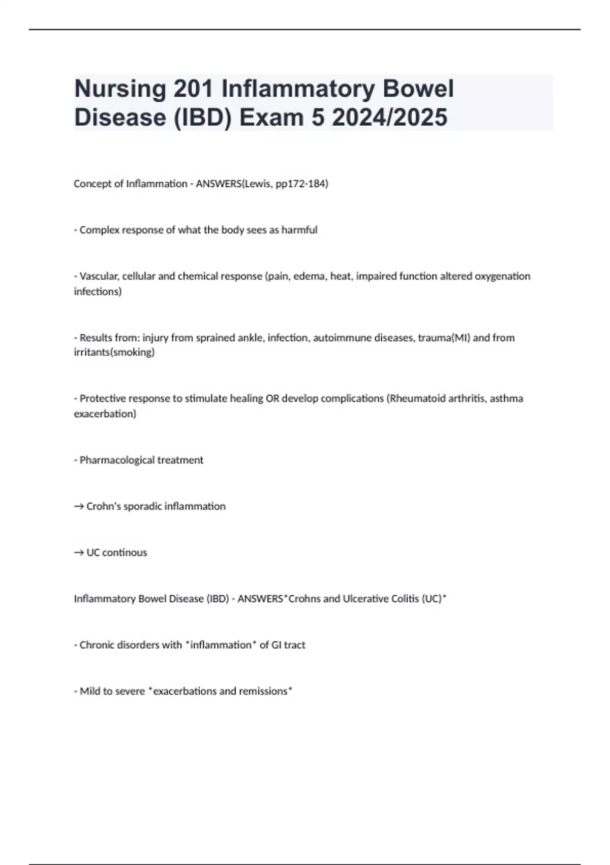 Nursing 201 Inflammatory Bowel Disease (IBD) Exam 5 2024/2025 Concept of Inflammation - ANSWERS(Lewis, pp172-184) - Complex response of what the body sees as harmful - Vascular, cellular and chemical response (pain, edema, heat, impaired function altered oxygenation infections) - Results from: injury from sprained ankle, infection, autoimmune diseases, trauma(MI) and from irritants(smoking) - Protective response to stimulate healing OR develop complications (Rheumatoid arthritis, asthma exacerbation) - Pharmacological treatment → Crohn's sporadic inflammation → UC continous Inflammatory Bowel Disease (IBD) - ANSWERS*Crohns and Ulcerative Colitis (UC)* - Chronic disorders with *inflammation* of GI tract - Mild to severe *exacerbations and remissions*