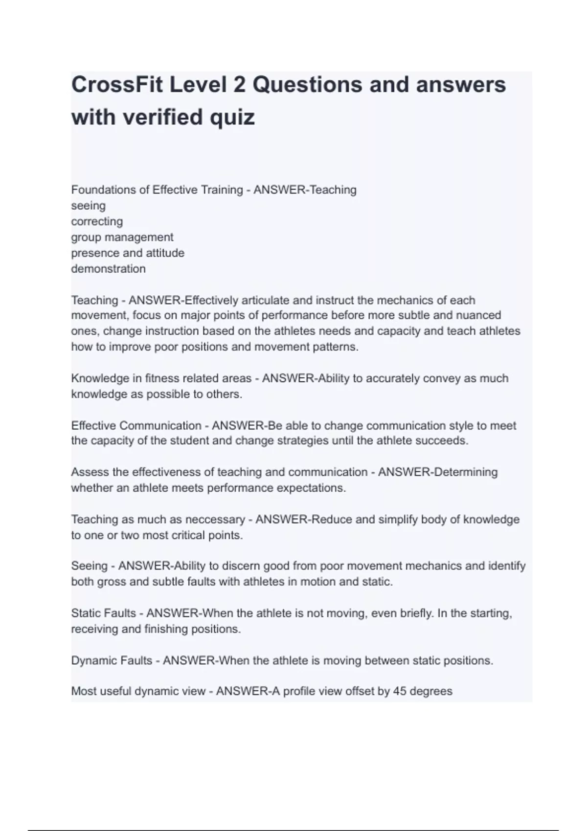 CrossFit Level 2 Questions and answers with verified quiz Foundations of Effective Training - ANSWER-Teaching seeing correcting group management presence and attitude demonstration Teaching - ANSWER-Effectively articulate and instruct the mechanics of each movement, focus on major points of performance before more subtle and nuanced ones, change instruction based on the athletes needs and capacity and teach athletes how to improve poor positions and movement patterns. Knowledge in fitness related areas - ANSWER-Ability to accurately convey as much knowledge as possible to others. Effective Communication - ANSWER-Be able to change communication style to meet the capacity of the student and change strategies until the athlete succeeds. Assess the effectiveness of teaching and communication - ANSWER-Determining whether an athlete meets performance expectations. Teaching as mu