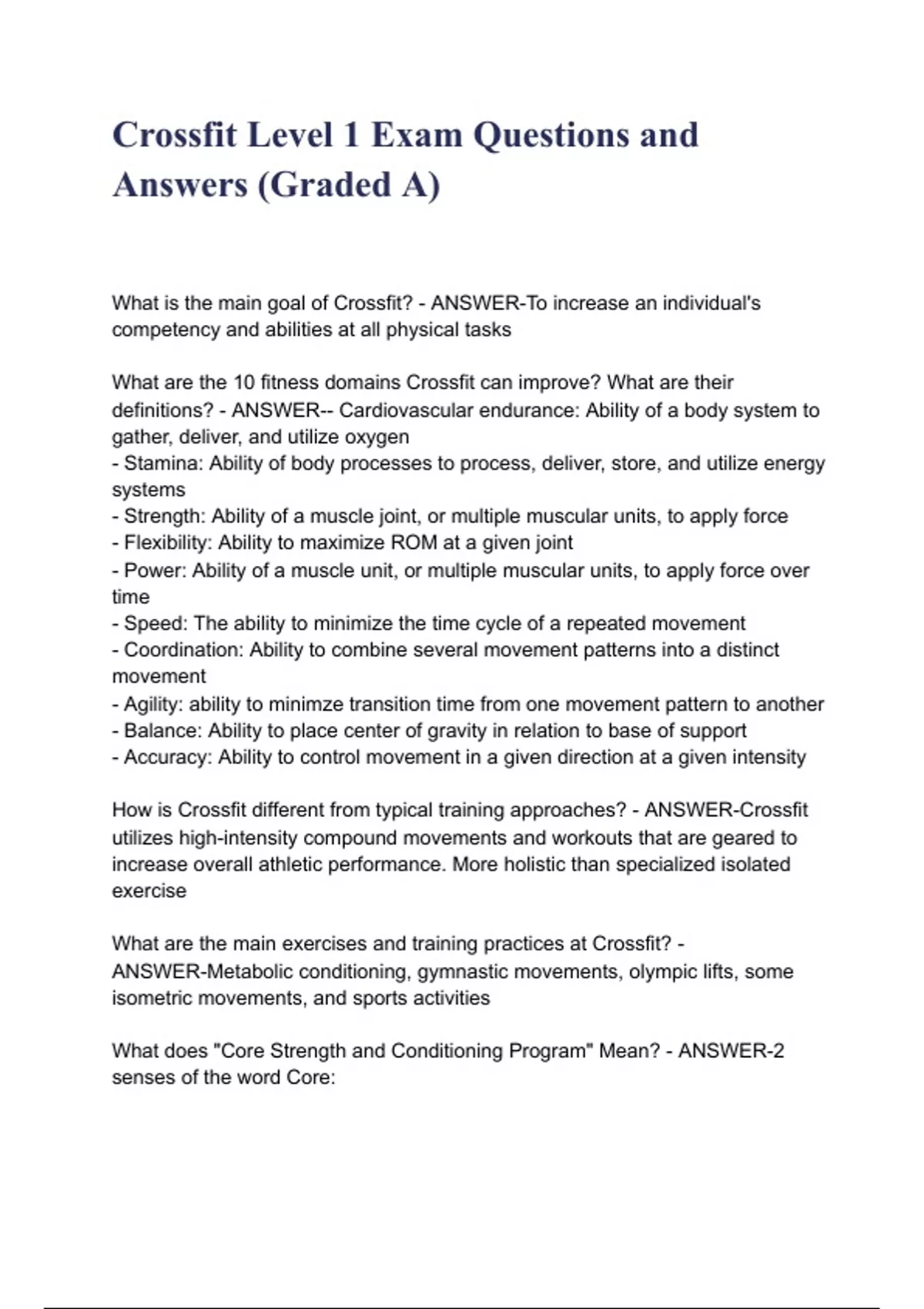 Crossfit Level 1 Exam Questions and Answers (Graded A) What is the main goal of Crossfit? - ANSWER-To increase an individual's competency and abilities at all physical tasks What are the 10 fitness domains Crossfit can improve? What are their definitions? - ANSWER-- Cardiovascular endurance: Ability of a body system to gather, deliver, and utilize oxygen - Stamina: Ability of body processes to process, deliver, store, and utilize energy systems - Strength: Ability of a muscle joint, or multiple muscular units, to apply force - Flexibility: Ability to maximize ROM at a given joint - Power: Ability of a muscle unit, or multiple muscular units, to apply force over time - Speed: The ability to minimize the time cycle of a repeated movement - Coordination: Ability to combine several movement patterns into a distinct movement - Agility: ability to minimze transition time from one movement pattern to another - Balance