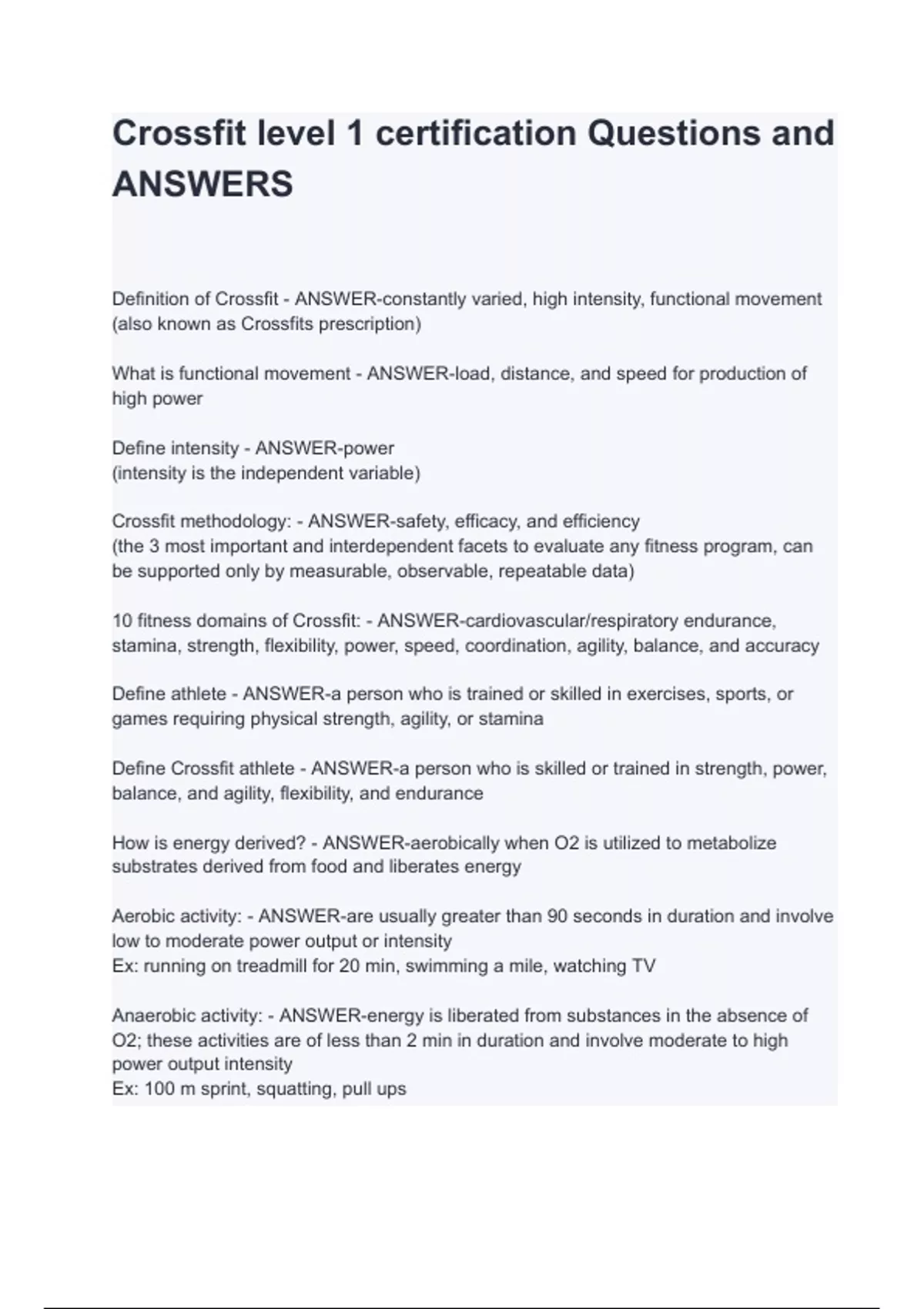 Crossfit level 1 certification Questions and ANSWERS Definition of Crossfit - ANSWER-constantly varied, high intensity, functional movement (also known as Crossfits prescription) What is functional movement - ANSWER-load, distance, and speed for production of high power Define intensity - ANSWER-power (intensity is the independent variable) Crossfit methodology: - ANSWER-safety, efficacy, and efficiency (the 3 most important and interdependent facets to evaluate any fitness program, can be supported only by measurable, observable, repeatable data) 10 fitness domains of Crossfit: - ANSWER-cardiovascular/respiratory endurance, stamina, strength, flexibility, power, speed, coordination, agility, balance, and accuracy Define athlete - ANSWER-a person who is trained or skilled in exercises, sports, or games requiring physical strength, agility, or stamina Define Crossfi
