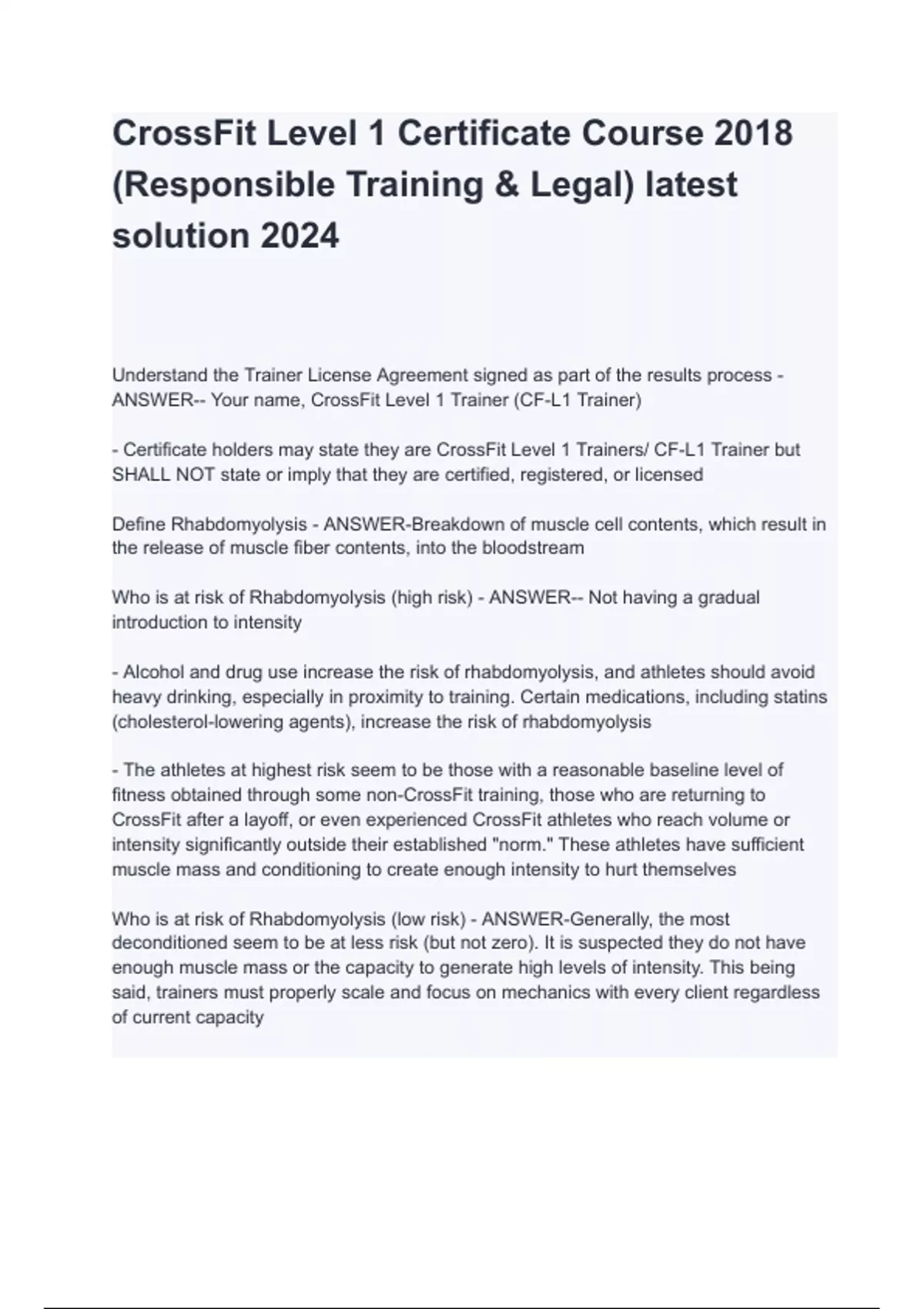 CrossFit Level 1 Certificate Course 2018 (Responsible Training & Legal) latest solution 2024 Understand the Trainer License Agreement signed as part of the results process - ANSWER-- Your name, CrossFit Level 1 Trainer (CF-L1 Trainer) - Certificate holders may state they are CrossFit Level 1 Trainers/ CF-L1 Trainer but SHALL NOT state or imply that they are certified, registered, or licensed Define Rhabdomyolysis - ANSWER-Breakdown of muscle cell contents, which result in the release of muscle fiber contents, into the bloodstream Who is at risk of Rhabdomyolysis (high risk) - ANSWER-- Not having a gradual introduction to intensity - Alcohol and drug use increase the risk of rhabdomyolysis, and athletes should avoid heavy drinking, especially in proximity to training. Certain medications, including statins (cholesterol-lowering