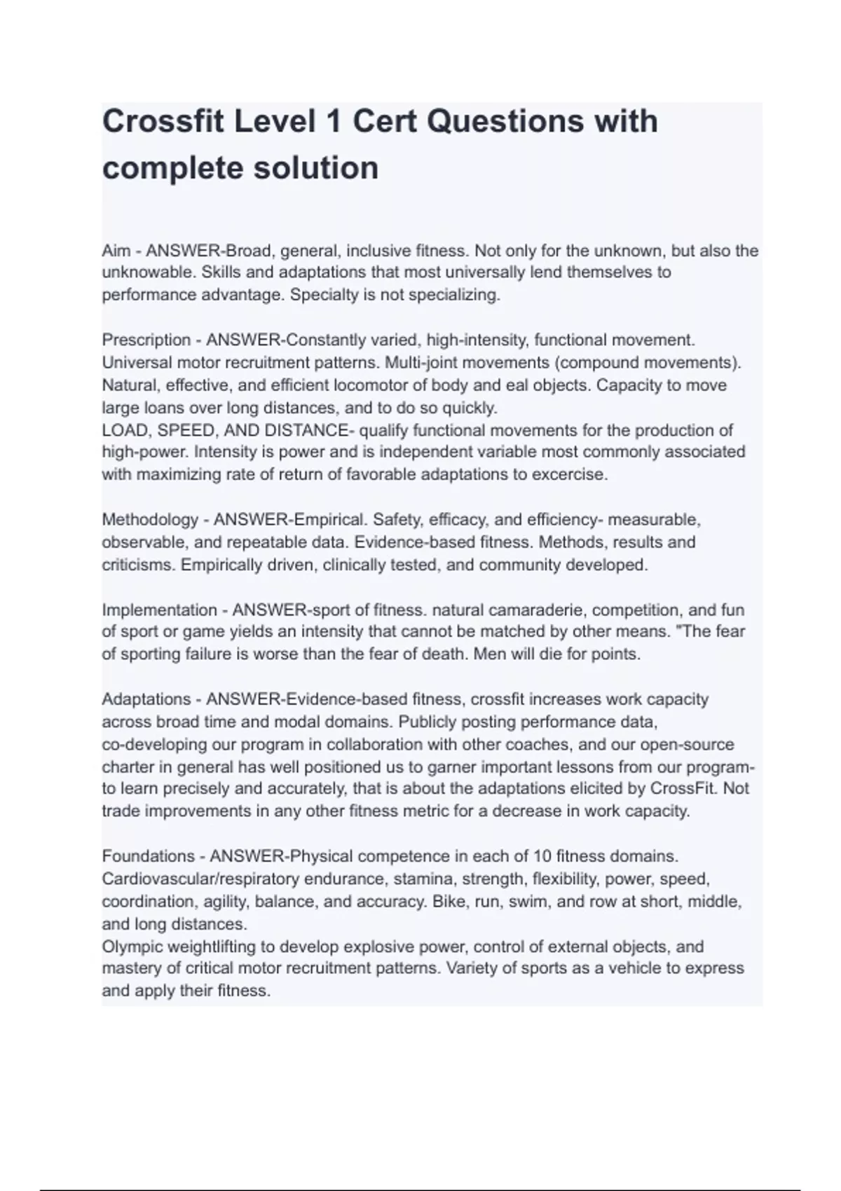 Crossfit Level 1 Cert Questions with complete solution Aim - ANSWER-Broad, general, inclusive fitness. Not only for the unknown, but also the unknowable. Skills and adaptations that most universally lend themselves to performance advantage. Specialty is not specializing. Prescription - ANSWER-Constantly varied, high-intensity, functional movement. Universal motor recruitment patterns. Multi-joint movements (compound movements). Natural, effective, and efficient locomotor of body and eal objects. Capacity to move large loans over long distances, and to do so quickly. LOAD, SPEED, AND DISTANCE- qualify functional movements for the production of high-power. Intensity is power and is independent variable most commonly associated with maximizing rate of return of favorable adaptations to excercise. Methodology - ANSWER-Empirical. Safety, efficacy, and efficiency- measurable, observable, and repeatable data. Evidence-based fitness. Methods, results and criticisms. Empirically driven, clinically tested, and community developed. Implementation - ANSWER-sport of fitness. natural camaraderie, competition, and fun of sport or game yields an intensity that cannot be matched by other means. "The fear of sporting failure is worse than the fear of death. Men will die for points. Adaptations - ANS