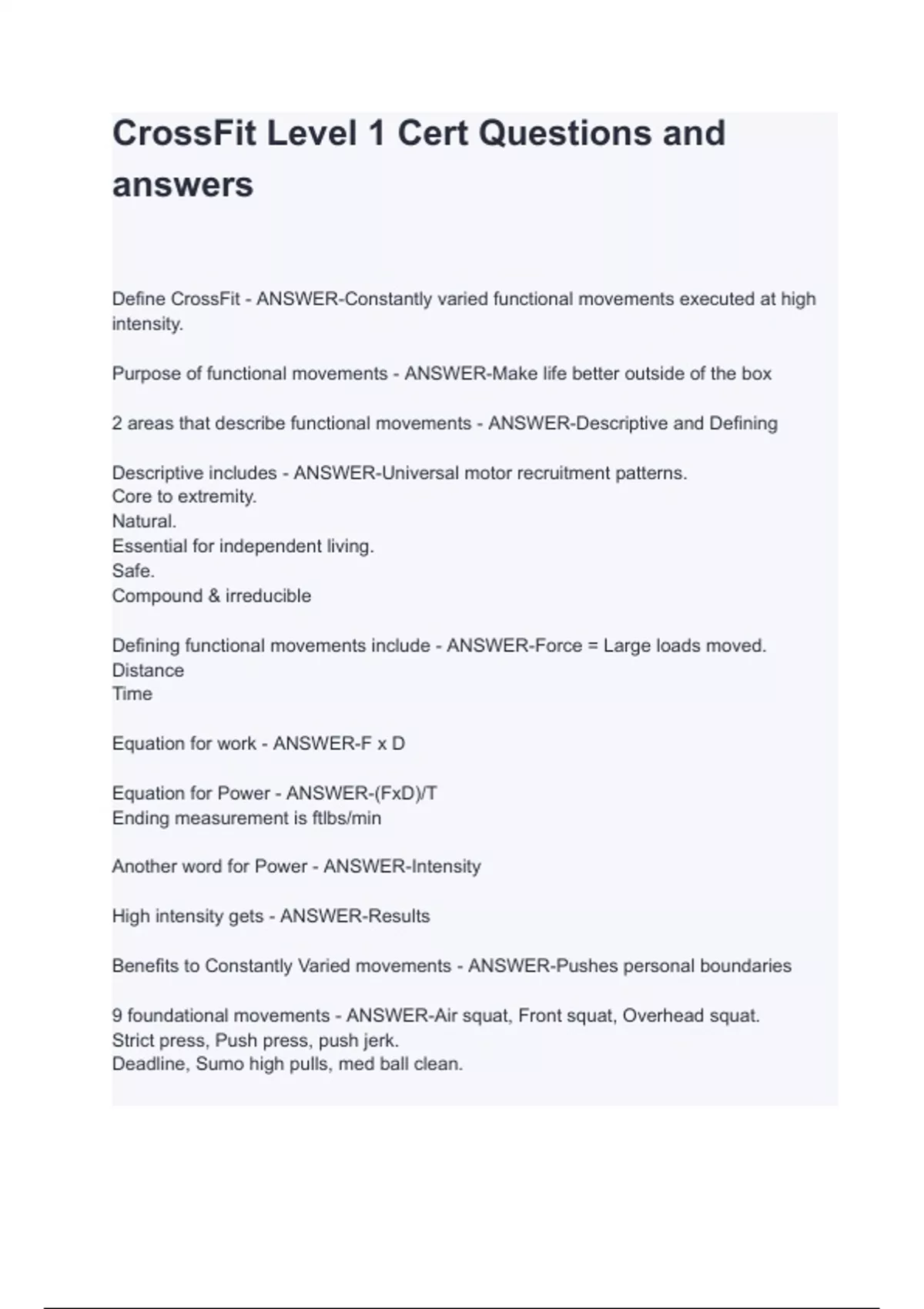 CrossFit Level 1 Cert Questions and answers