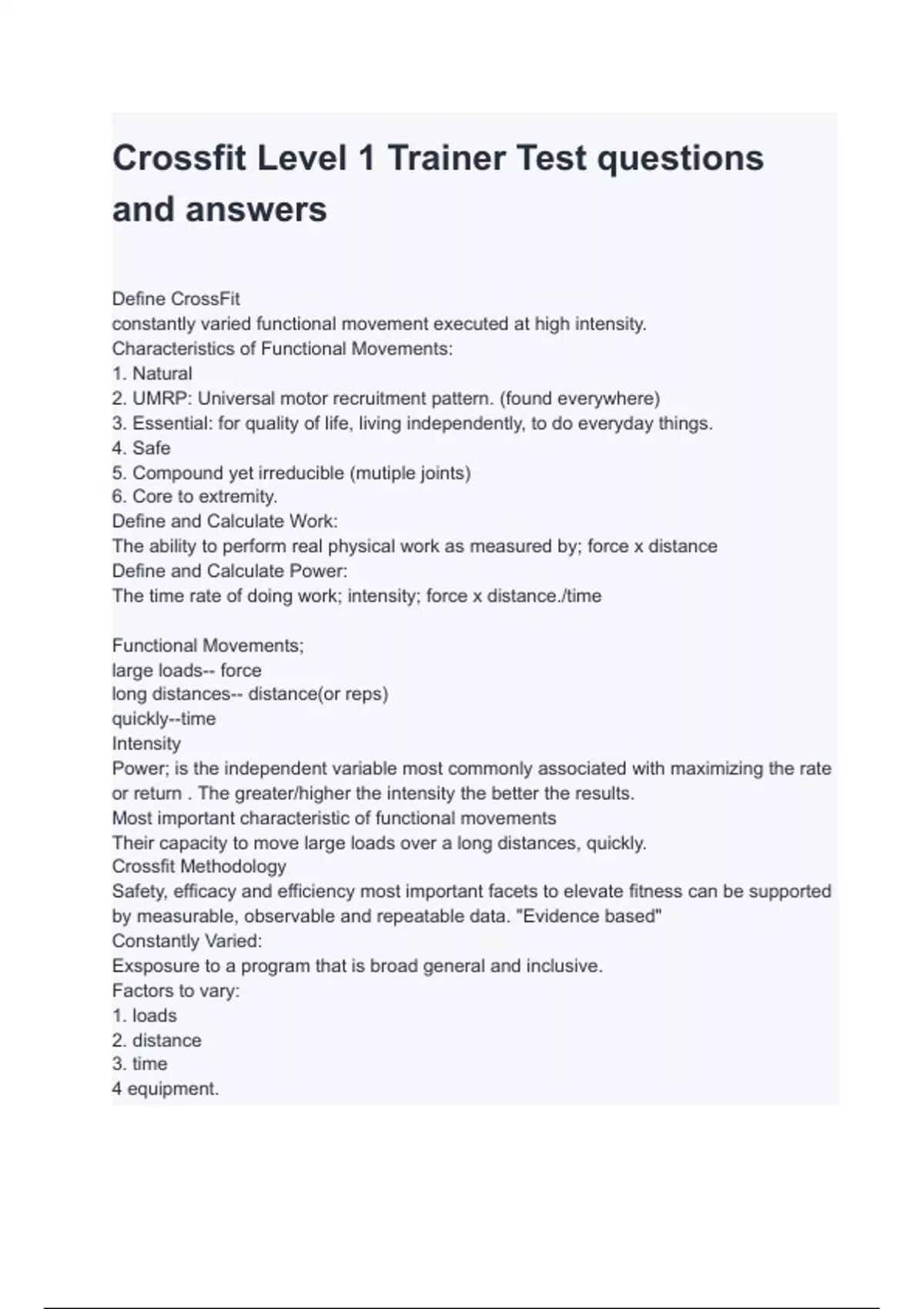 Crossfit Level 1 Trainer Test questions and answers Define CrossFit constantly varied functional movement executed at high intensity. Characteristics of Functional Movements: 1. Natural 2. UMRP: Universal motor recruitment pattern. (found everywhere) 3. Essential: for quality of life, living independently, to do everyday things. 4. Safe 5. Compound yet irreducible (mutiple joints) 6. Core to extremity. Define and Calculate Work: The ability to perform real physical work as measured by; force x distance Define and Calculate Power: The time rate of doing work; intensity; force x distance./time Functional Movements; large loads-- force long distances-- d