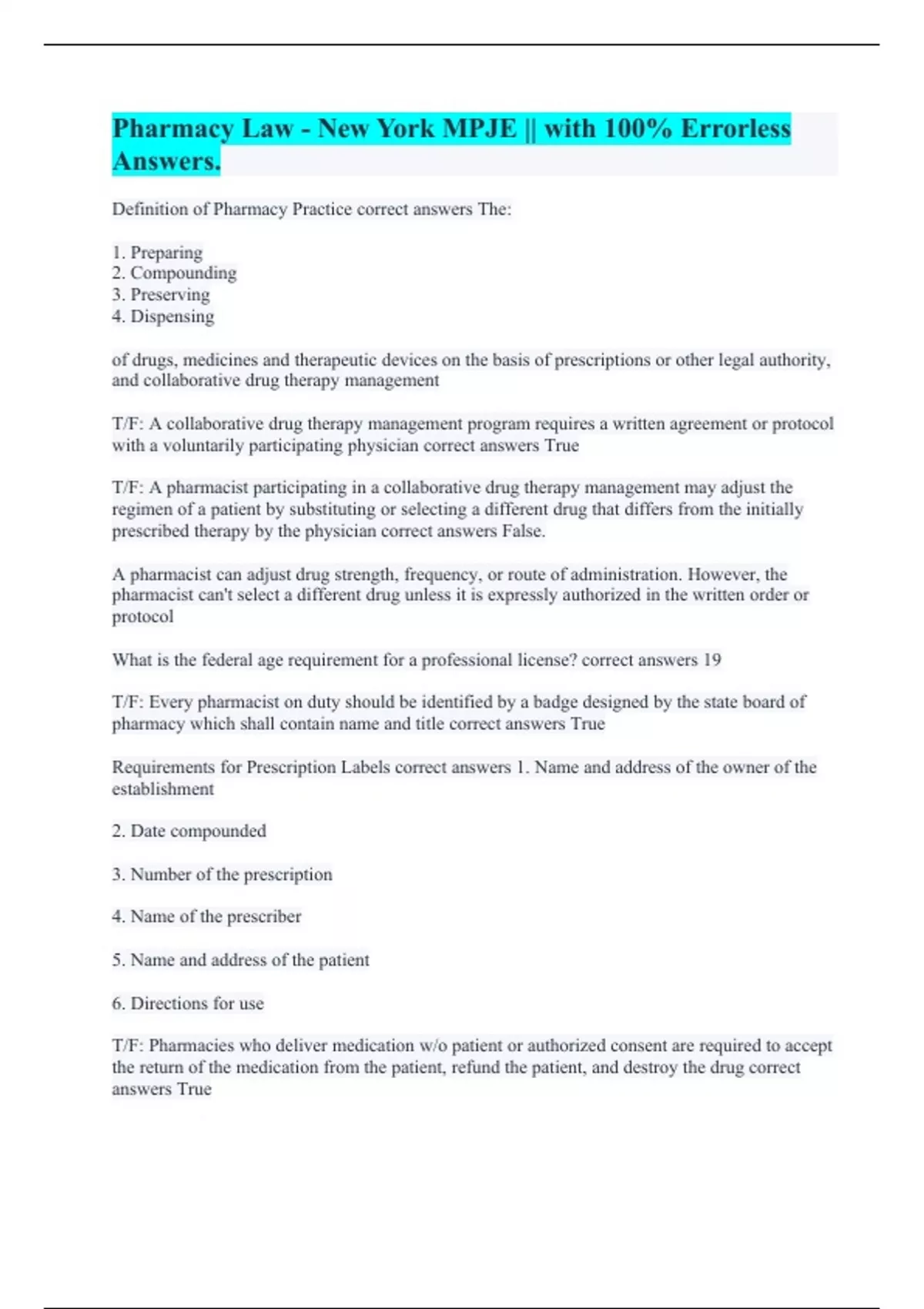 Pharmacy Law - New York MPJE || with 100% Errorless Answers.