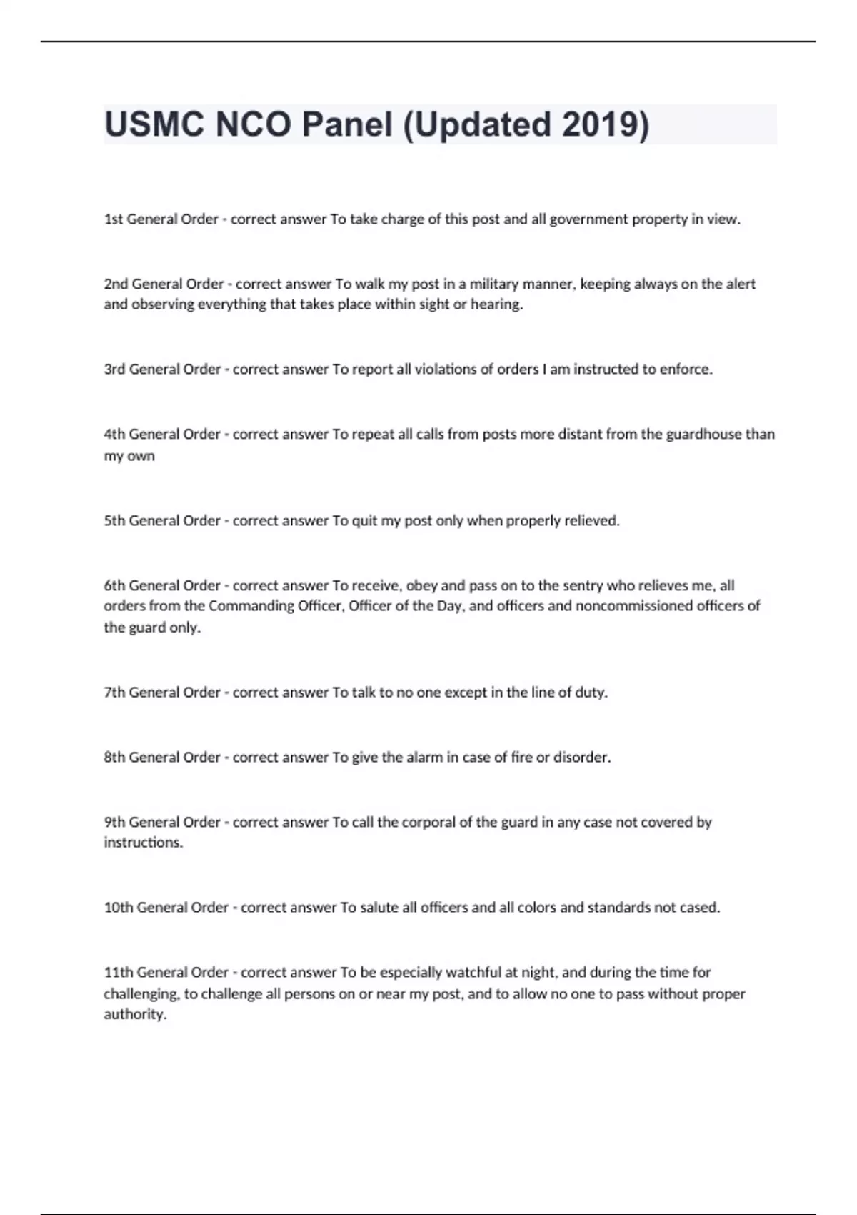 USMC NCO Panel (Updated 2019) Question and answers 1st General Order - correct answer To take charge of this post and all government property in view. 2nd General Order - correct answer To walk my post in a military manner, keeping always on the alert and observing everything that takes place within sight or hearing. 3rd General Order - correct answer To report all violations of orders I am instructed to enforce. 4th General Order - correct answer To repeat all calls from posts more distant from the guardhouse than my own 5th General Order - correct answer To quit my post only when properly relieved. 6th General Order - correct answer To receive, obey and pass on to the sentry who relieves me, all orders from th