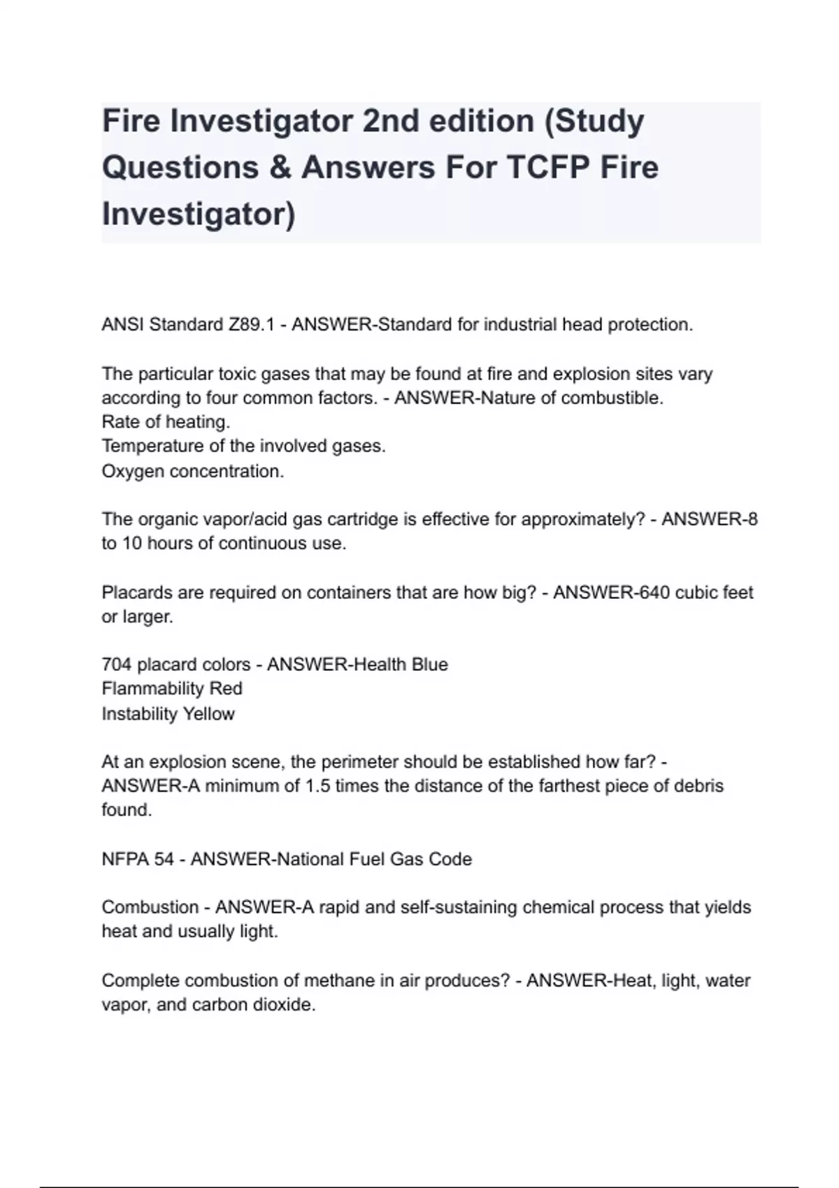 Fire Investigator 2nd edition (Study Questions & Answers For TCFP Fire Investigator) ANSI Standard Z89.1 - ANSWER-Standard for industrial head protection. The particular toxic gases that may be found at fire and explosion sites vary according to four common factors. - ANSWER-Nature of combustible. Rate of heating. Temperature of the involved gases. Oxygen concentration. The organic vapor/acid gas cartridge is effective for approximately? - ANSWER-8 to 10 hours of continuous use. Placards are req