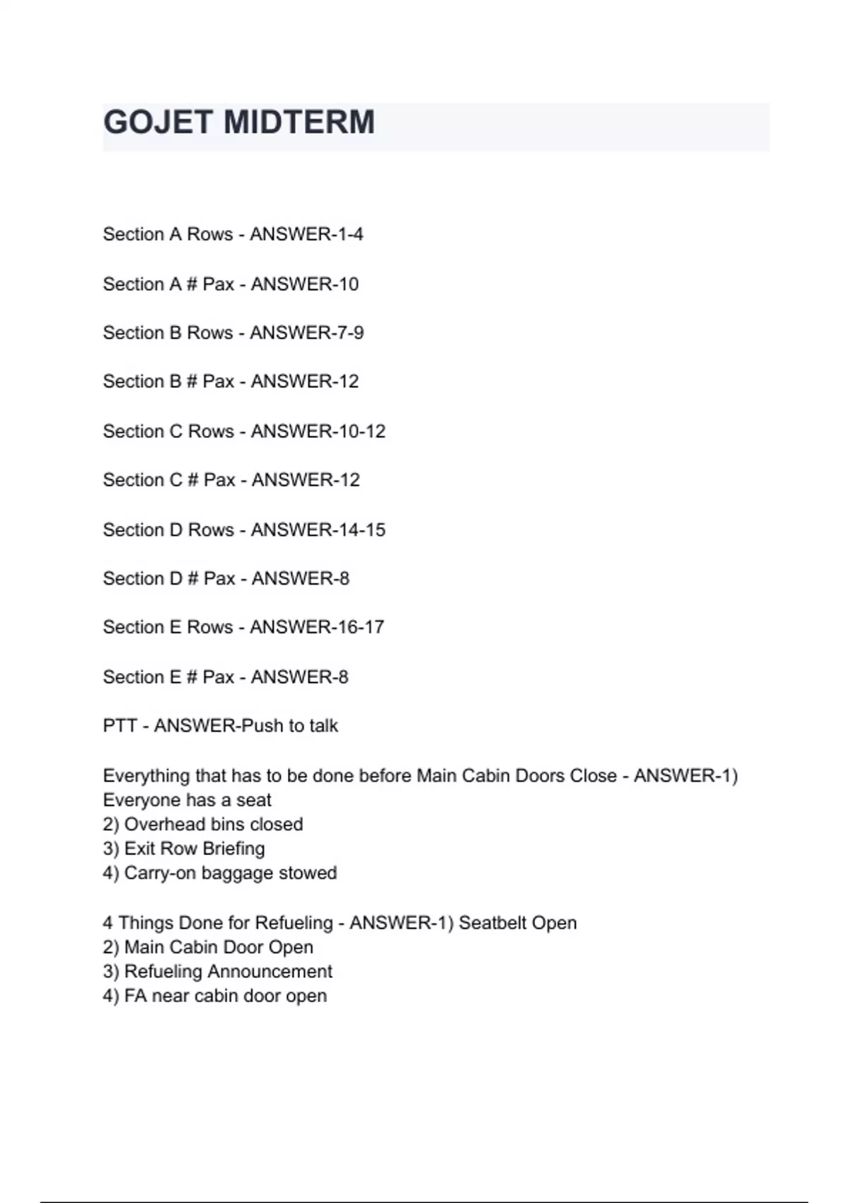 GOJET MIDTERM Section A Rows - ANSWER-1-4 Section A # Pax - ANSWER-10 Section B Rows - ANSWER-7-9 Section B # Pax - ANSWER-12 Section C Rows - ANSWER-10-12 Section C # Pax - ANSWER-12 Section D Rows - ANSWER-14-15 Section D # Pax - ANSWER-8 Section E Rows - ANSWER-16-17 Section E # Pax - ANSWER-8 PTT - ANSWER-Push to talk Everything that has to be done before Main Cabin Doors Close - ANSWER-1) Everyone has a seat 2) Overhead bins closed 3) Exit Row Briefing