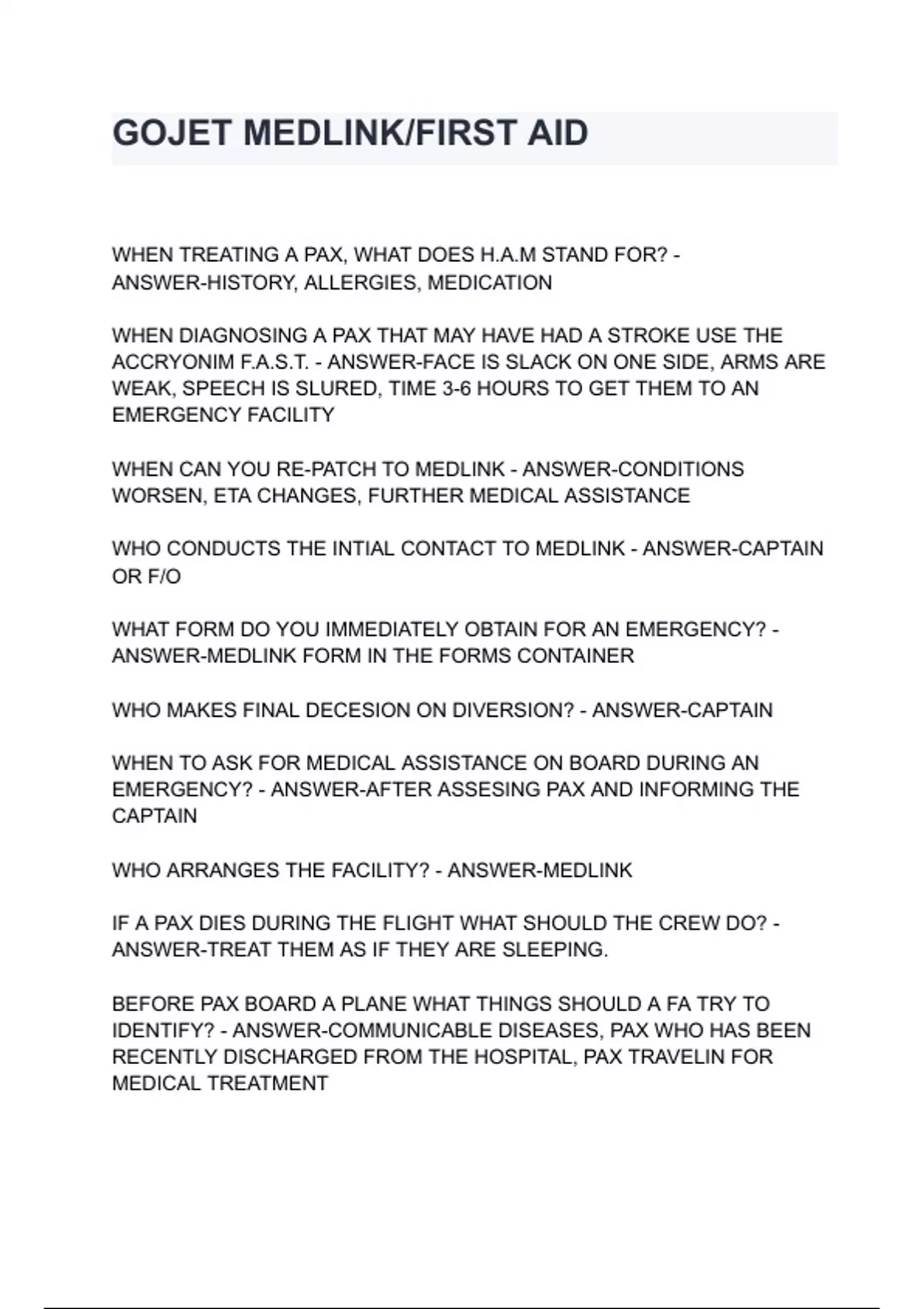 GOJET MEDLINK/FIRST AID WHEN TREATING A PAX, WHAT DOES H.A.M STAND FOR? - ANSWER-HISTORY, ALLERGIES, MEDICATION WHEN DIAGNOSING A PAX THAT MAY HAVE HAD A STROKE USE THE ACCRYONIM F.A.S.T. - ANSWER-FACE IS SLACK ON ONE SIDE, ARMS ARE WEAK, SPEECH IS SLURED, TIME 3-6 HOURS TO GET THEM TO AN EMERGENCY FACILITY WHEN CAN YOU RE-PATCH TO MEDLINK - ANSWER-CONDITIONS WORSEN, ETA CHANGES, FURTHER MEDICAL ASSISTANCE WHO CONDUCTS THE INTIAL CONTACT TO MEDLINK - ANSWER-CAPTAIN OR F/O WHAT FORM DO YOU IMMEDIATELY OBTAIN FOR AN EMERGENCY? - ANSWER-MEDLINK FORM IN THE FORMS CONTAINER WHO MAKES FINAL DECESION ON DIVERSION? - ANSWER-CAPTAIN WHEN TO ASK FOR MEDICAL ASSISTANCE ON BOARD DURING AN EMERGENCY? - ANSWER-AFTER ASSESING PAX AND INFORMING THE CAPTAIN WHO ARRANGES T