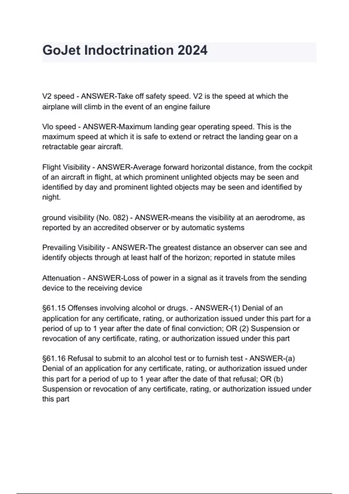 GoJet Indoctrination 2024 V2 speed - ANSWER-Take off safety speed. V2 is the speed at which the airplane will climb in the event of an engine failure Vlo speed - ANSWER-Maximum landing gear operating speed. This is the maximum speed at which it is safe to extend or retract the landing gear on a retractable gear aircraft. Flight Visibility - ANSWER-Average forward horizontal distance, from the cockpit of an aircraft in flight, at which prominent unlighted objects may be seen and identified by day and prominent lighted objects may be seen and identified by night. ground visibility (No. 082) - ANSWER-means the visibility at an aerodrome, as reported by an accredited observer or by automatic systems Prevailing Visibility - ANSWER-The greatest distance an observer can see and identify objects through at least half of the horizon; reported in statute miles Attenuation - ANSWER-Loss of power in a signal as it travels from the sending device to the receiving device §61.15 Offenses involving alcohol or drugs. - ANSWER-(1) Denial of an application for any certificate, rating, or authorization issued under this part for a period of up to 1 year after the date of final conviction; OR (2) Suspension or revocation of any certifica
