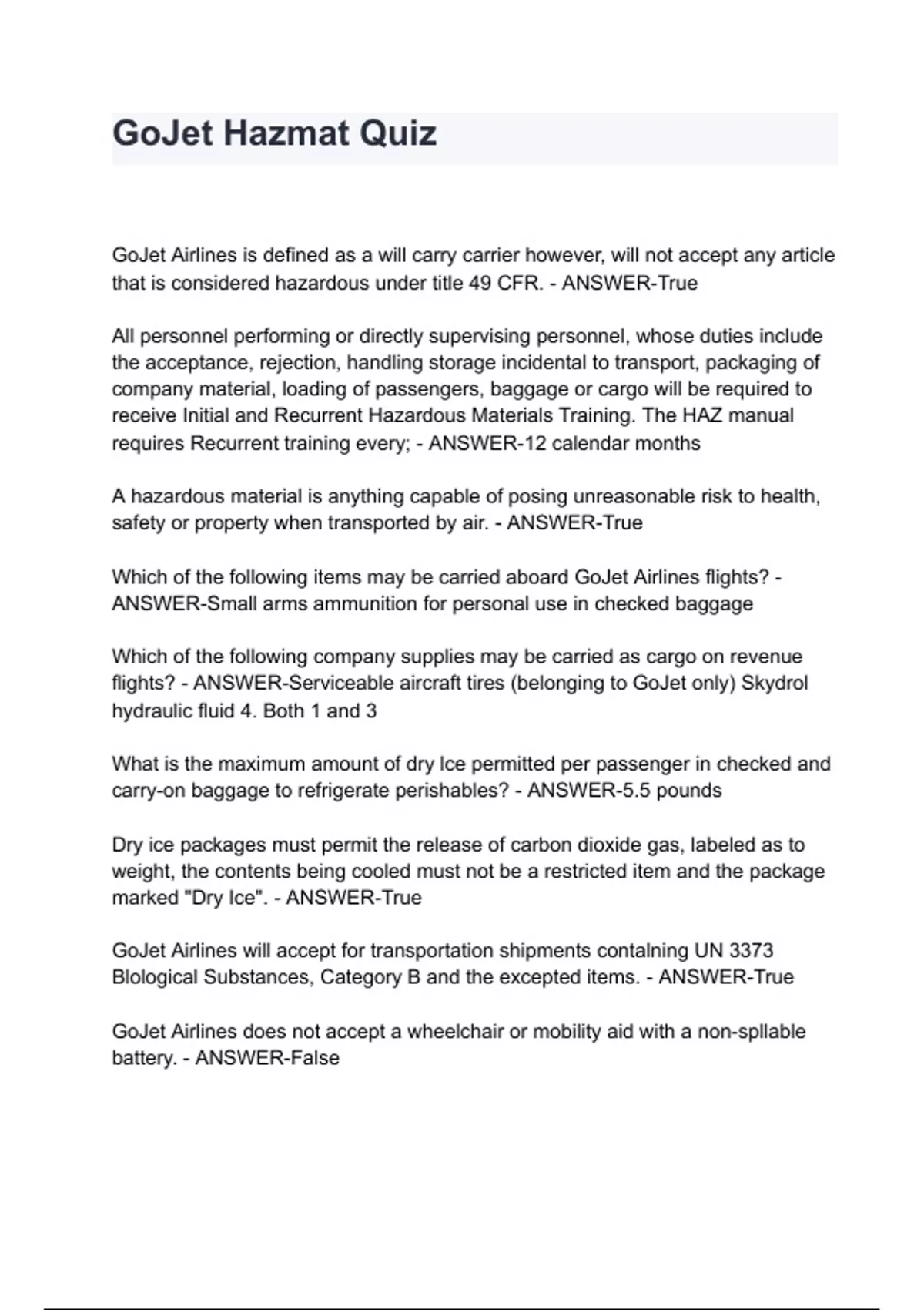 GoJet Hazmat Quiz GoJet Airlines is defined as a will carry carrier however, will not accept any article that is considered hazardous under title 49 CFR. - ANSWER-True All personnel performing or directly supervising personnel, whose duties include the acceptance, rejection, handling storage incidental to transport, packaging of company material, loading of passengers, baggage or cargo will be required to receive Initial and Recurrent Hazardous Materials Training. The HAZ manual requires Recurrent training every; - ANSWER-12 calendar months A hazardous material is anything capable of posing unreasonable risk to health, safety or property when transported by air. - ANSWER-True Which of the following items may be carried aboard GoJet Airlines flights? - ANSWER-Small arms ammunition for personal use in checked baggage Which of the following company supplies may be carried as cargo on revenue flights? - ANSWER-Serviceable aircraft tires (belonging to GoJet only) Skydrol hydraulic fluid 4. Both 1 and 3 What is the maximum amount of dry lce permitted per passenger in checked and carry-on baggage to refrigerate perishables? - ANSWER-5.5 pounds Dry ice packages m