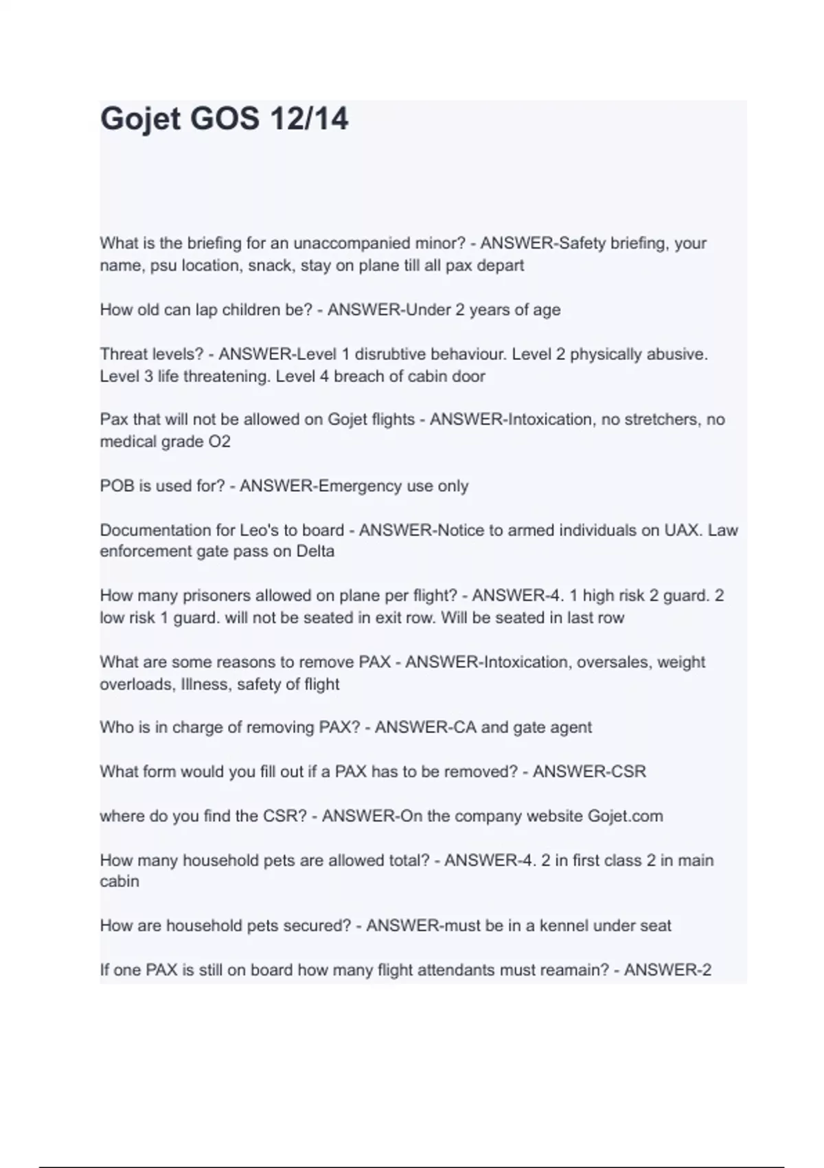 Gojet GOS 12/14 What is the briefing for an unaccompanied minor? - ANSWER-Safety briefing, your name, psu location, snack, stay on plane till all pax depart How old can lap children be? - ANSWER-Under 2 years of age Threat levels? - ANSWER-Level 1 disrubtive behaviour. Level 2 physically abusive. Level 3 life threatening. Level 4 breach of cabin door Pax that will not be allowed on Gojet flights - ANSWER-Intoxication, no stretchers, no medical grade O2 POB is used for? - ANSWER-Emergency use only Documentation for Leo's to board - ANSWER-Notice to armed individuals on UAX. Law enforcement gate pass on Delta How many prisoners allowed on plane per flight? - ANSWER-4. 1 high risk 2 guard. 2 low risk 1 guard. will not be seated in exit row. Will be seated in last row Wh