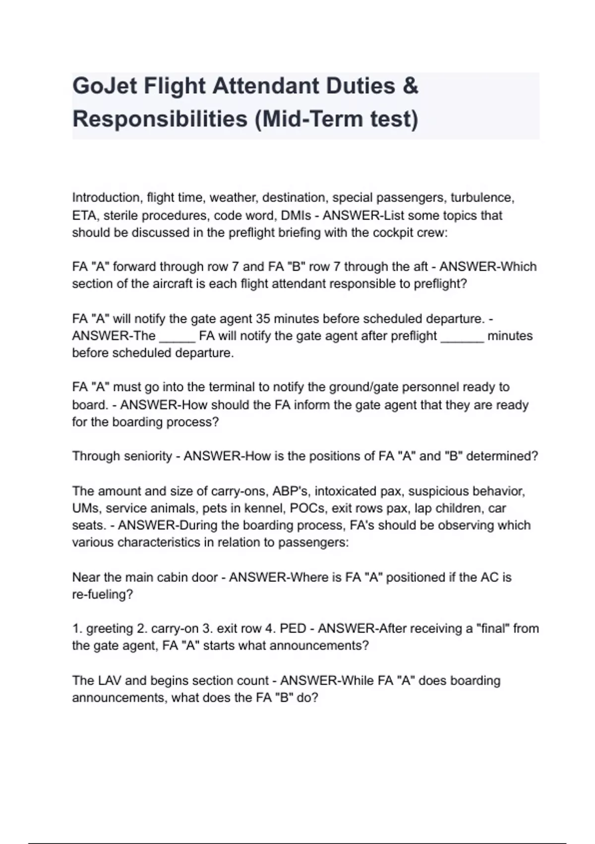 GoJet Flight Attendant Duties & Responsibilities (Mid-Term test) Introduction, flight time, weather, destination, special passengers, turbulence, ETA, sterile procedures, code word, DMIs - ANSWER-List some topics that should be discussed in the preflight briefing with the cockpit crew: FA "A" forward through row 7 and FA "B" row 7 through the aft - ANSWER-Which section of the aircraft is each flight attendant responsible to preflight? FA "A" will notify the gate agent 35 minutes before scheduled departure. - ANSWER-The _____ FA will notify the gate agent after preflight ______ minutes before scheduled departure. FA "A" must go into the terminal to notify the ground/gate personnel ready to board. - ANSWER-How should the FA inform the gate agent that they are ready for the boarding process? Through seniority - ANSWER-How is the positions of FA "A" and "B" determined? The amount and size of carry-ons, ABP's, intoxicated pax, suspicious behavior, UMs, service animals, pets in kennel, POCs, exit rows pax, lap children, car seats. - ANSWER-During the boarding process, FA's should be observing which various characteristics in relation to passengers: Near the main cabin door - ANSWER-Where is FA "A" positioned if the AC is re-fueling? 1. greeting 2. carry-on 3. e