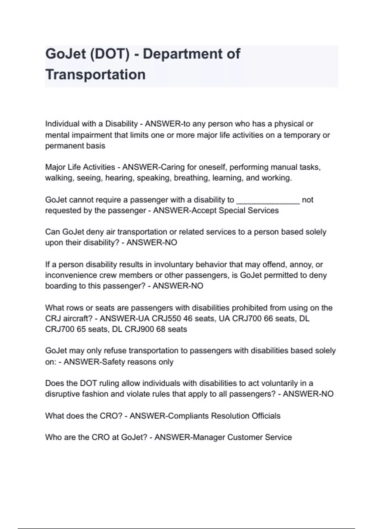 GoJet (DOT) - Department of Transportation Individual with a Disability - ANSWER-to any person who has a physical or mental impairment that limits one or more major life activities on a temporary or permanent basis Major Life Activities - ANSWER-Caring for oneself, performing manual tasks, walking, seeing, hearing, speaking, breathing, learning, and working. GoJet cannot require a passenger with a disability to ______________ not requested by the passenger - ANSWER-Accept Special Services Can GoJet deny air transportation or related services to a person based solely upon their disability? - ANSWER-NO If a person disability results in involuntary behavior that may offend, annoy, or inconvenience crew members or other passengers, is GoJet permitted to deny boarding to this passenger? - ANSWER-NO What rows or seats are passengers with disabilities prohibited from using on the CRJ aircraft? - ANSWER-UA CRJ550 46 seats, UA CRJ700 66 seats, DL CRJ700 65 seats, DL CRJ900 68 seats GoJet may only refuse transportation to passengers with disabilities based solely on: - ANSWER