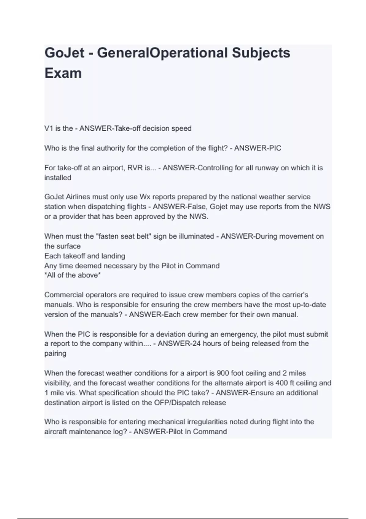 GoJet - General Operational Subjects Exam V1 is the - ANSWER-Take-off decision speed Who is the final authority for the completion of the flight? - ANSWER-PIC For take-off at an airport, RVR is... - ANSWER-Controlling for all runway on which it is installed GoJet Airlines must only use Wx reports prepared by the national weather service station when dispatching flights - ANSWER-False, Gojet may use reports from the NWS or a provider that has been approved by the NWS. When must the "fasten seat belt" sign be illuminated - ANSWER-During movement on the surface Each takeoff and landing Any time deemed necessary by the Pilot in Command *All of the above* Commercial operators are required to issue crew members copies of the carrier's manuals. Who is responsible for ensuring the crew members have the most up-to-date version of the manuals? - ANSWER-Each crew member for their own manual. When the PIC is responsible for a deviation during an emergency, the pilot must submit a report to the company within.... - ANSWER-24 hours of being released from the pairing When the forecast weather conditions for a airport is 900 foot ceiling and 2 miles visibility, and the forecast weather conditions for the alternate airport is 400 ft ceiling and 1 mile vis. What specification should the PIC take? - ANSWER-Ensure an additional destination airport is listed on the OFP/Dispatch release Who is responsible for entering m