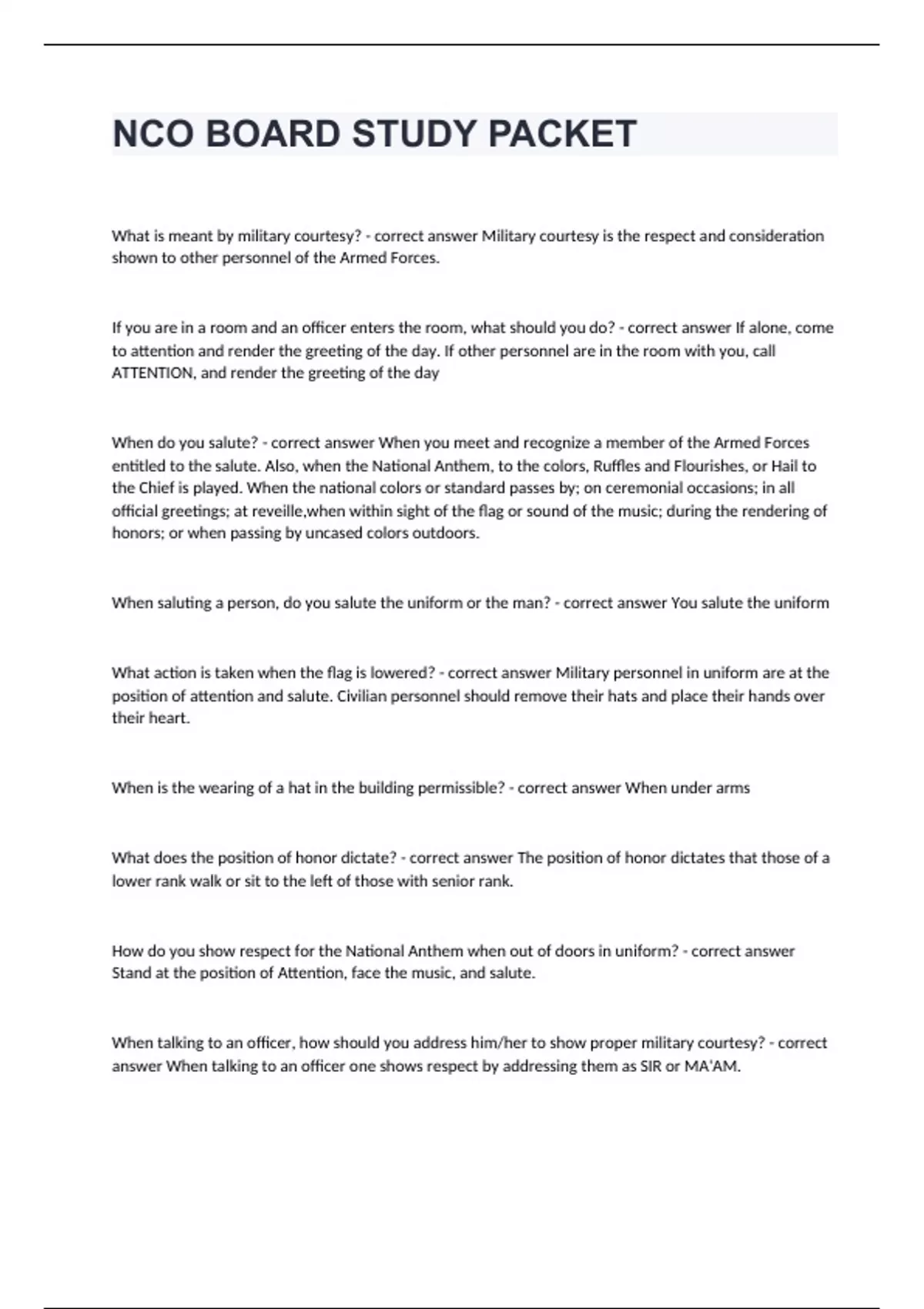 NCO BOARD STUDY PACKET Question and answers 2024 verified to passWhat is meant by military courtesy? - correct answer Military courtesy is the respect and consideration shown to other personnel of the Armed Forces. If you are in a room and an officer enters the room, what should you do? - correct answer If alone, come to attention and render the greeting of the day. If other personnel are in the room with you, call ATTENTION, and render the greeting of the day When do you salute? - correct answer When you meet and recognize a member of the Armed Forces entitled to the salute. Also, when the National Anthem, to the colors, Ruffles and Flourishes, or Hail to the Chief is played. When the national colors or standard passes by; on ceremonial occasions; in all official greetings; at reveille,when within sight of the flag or sound of the music; during the rendering of honors; or when passing by uncased colors outdoors. When saluting a person, do you salute the uniform or the man? - correct answer You salute the uniform What action is taken when the flag is lowered? - correct answer Military personnel in uniform are at the position of attention and salute. Civilian personnel should remove their hats and place their hands over their heart. When is the wearin