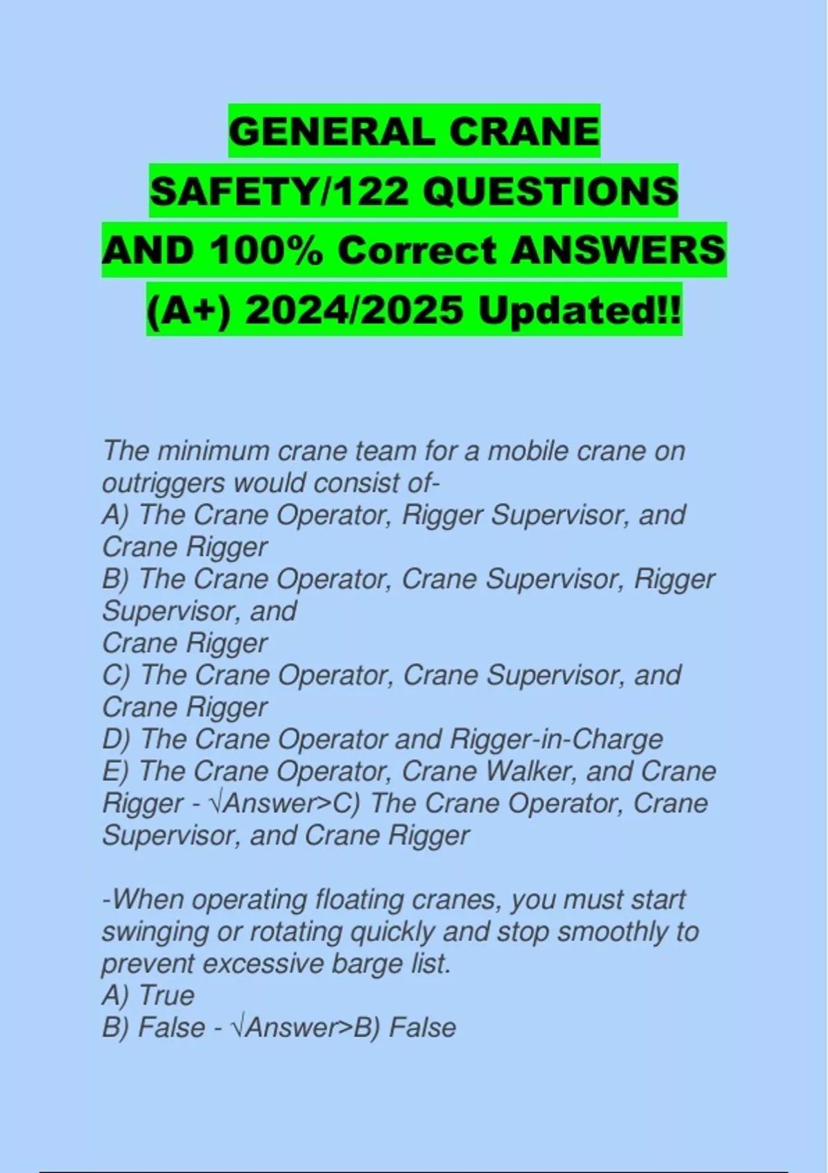 GENERAL CRANE SAFETY/122 QUESTIONS AND 100% Correct ANSWERS (A+) 2024/2025 Updated!!