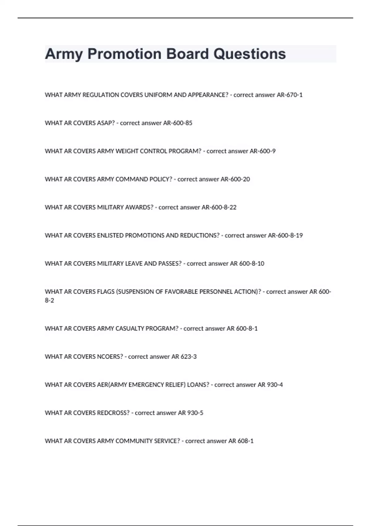 Army Promotion Board Questions with complete solution 2024 WHAT ARMY REGULATION COVERS UNIFORM AND APPEARANCE? - correct answer AR-670-1 WHAT AR COVERS ASAP? - correct answer AR-600-85 WHAT AR COVERS ARMY WEIGHT CONTROL PROGRAM? - correct answer AR-600-9 WHAT AR COVERS ARMY COMMAND POLICY? - correct answer AR-600-20 WHAT AR COVERS MILITARY AWARDS? - correct answer AR-600-8-22 WHAT AR COVERS ENLISTED PROMOTIONS AND REDUCTIONS? - correct answer AR-600-8-19 WHAT AR COVERS MILITARY LEAVE AND PASSES? - correct answer AR 600-8-10 WHAT AR COVERS FLAGS (SUSPENSION OF FAVORABLE PERSONNEL ACTION)? - correct answer AR 600-8-2 WHAT AR COVERS AR
