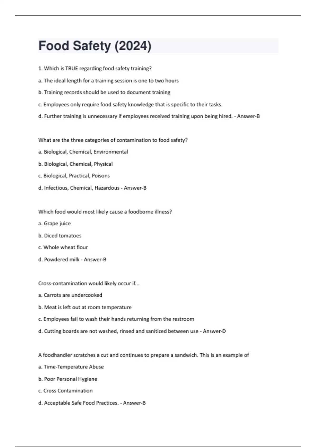 1. Which is TRUE regarding food safety training? a. The ideal length for a training session is one to two hours b. Training records should be used to document training c. Employees only require food safety knowledge that is specific to their tasks. d. Further training is unnecessary if employees received training upon being hired. - Answer-B What are the three categories of contamination to food safety? a. Biological, Chemical, Environmental b. Biological, Chemical, Physical c. Biological, Practical, Poisons d. Infectious, Chemical, Hazardous - Answer-B Which food would most likely cause a foodborne illness? a. Grape juice b. Diced tomatoes c. Whole wheat flour d. Powdered milk - Answer-B Cross-contamination would likely occur if... a. Carrots are undercooked b. Meat is left out at room temperature c. Employees fail to wash their hands returning from the restroom d. Cutting boards are not washed, rinsed and sanitized between use - Answer-D A foodhandler scratches a cut and continues to prepare a sandwich. This is an example of a. Time-Temperature Abuse b. Poor Personal Hygiene c. Cross Contamination d. Acceptable Safe Food Practices. - Answer-BLeft over chili is left sitting out to cool on the counter, this is an example of? a. Time-Temperature Abuse b. Cross Contamination c. Poor Personal Hygiene d. Poor Cleaning and Sanitizing - Answer-A A foodhandler sprays cleaner on a prep table next to ready-to-eat tuna salad; this is an example of a. Time-Temperature Abuse b. Poor Personal Hygiene c. Cross Contamination d. Chemical Contamination - Answer-D Cross-contamination can be prevented if utensils are washed after each use - Answer-F Time-temperature abuse is when food stays too long at temperatures between 41°F-135°F - AnswerT Adults are more likely than pre-school age children to get sick from contaminated food - Answer-F An example of preventing cross contamination is when you prepare raw meats separately from ready-to-eat foods - Answer-T The FDA Food Code Model is an actual law that food establishments must follow - Answer-F Purchasing fresh fish from a recreational fisherman could pose a threat to food safety - Answer-T A foodborne-illness outbreak is two or more people sick from eating at the same place - Answer-F USDA is a federal agency responsible for inspection of meats, poultry and shell eggs - Answer-T