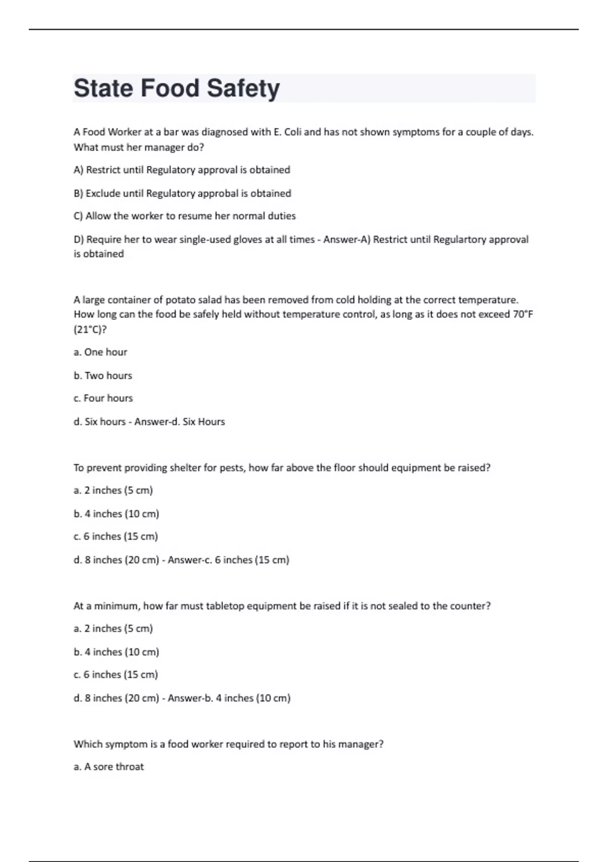 A Food Worker at a bar was diagnosed with E. Coli and has not shown symptoms for a couple of days. What must her manager do? A) Restrict until Regulatory approval is obtained B) Exclude until Regulatory approbal is obtained C) Allow the worker to resume her normal duties D) Require her to wear single-used gloves at all times - Answer-A) Restrict until Regulartory approval is obtained A large container of potato salad has been removed from cold holding at the correct temperature. How long can the food be safely held without temperature control, as long as it does not exceed 70°F (21°C)? a. One hour b. Two hours c. Four hours d. Six hours - Answer-d. Six Hours To prevent providing shelter for pests, how far above the floor should equipment be raised? a. 2 inches (5 cm) b. 4 inches (10 cm) c. 6 inches (15 cm) d. 8 inches (20 cm) - Answer-c. 6 inches (15 cm) At a minimum, how far must tabletop equipment be raised if it is not sealed to the counter? a. 2 inches (5 cm) b. 4 inches (10 cm) c. 6 inches (15 cm) d. 8 inches (20 cm) - Answer-b. 4 inches (10 cm) Which symptom is a food worker required to report to his manager? a. A sore throatb. Stomach cramps c. Sensitivity to light d. An infected wound - Answer-d. An infected wound A food worker needs to measure the temperature of a casserole. Where must the thermometer be placed when measuring this cooking temperature? a. In the middle of the casserole b. On the top of the food surface c. In several areas of the casserole d. On the edge of the casserole dish - Answer-c. In several areas of the casserole