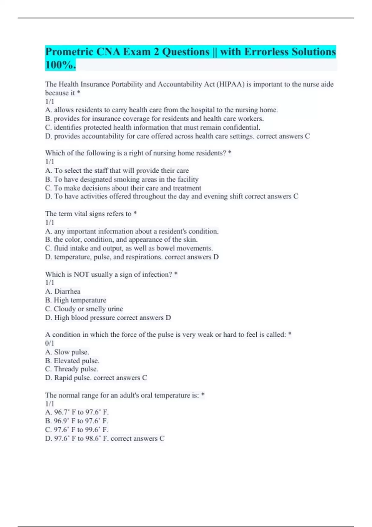 The Health Insurance Portability and Accountability Act (HIPAA) is important to the nurse aide because it * 1/1 A. allows residents to carry health care from the hospital to the nursing home. B. provides for insurance coverage for residents and health care workers. C. identifies protected health information that must remain confidential. D. provides accountability for care offered across health care settings. correct answers C Which of the following is a right of nursing home residents? * 1/1 A. To select the staff that will provide their care B. To have designated smoking areas in the facility C. To make decisions about their care and treatment D. To have activities offered throughout the day and evening shift correct answers C The term vital signs refers to * 1/1 A. any important information about a resident's condition. B. the color, condition, and appearance of the skin. C. fluid intake and output, as well as bowel movements. D. temperature, pulse, and respirations. correct answers D Which is NOT usually a sign of infection? * 1/1 A. Diarrhea B. High temperature C. Cloudy or smelly urine D. High blood pressure correct answers D A condition in which the force of the pulse is very weak or hard to feel is called: * 0/1 A. Slow pulse. B. Elevated pulse. C. Thready pulse. D. Rapid pulse. correct answers C The normal range for an adult's oral temperature is: * 1/1 A. 96.7˚ F to 97.6˚ F. B. 96.9˚ F to 97.6˚ F. C. 97.6˚ F to 99.6˚ F. D. 97.6˚ F to 98.6˚ F. correct answers C