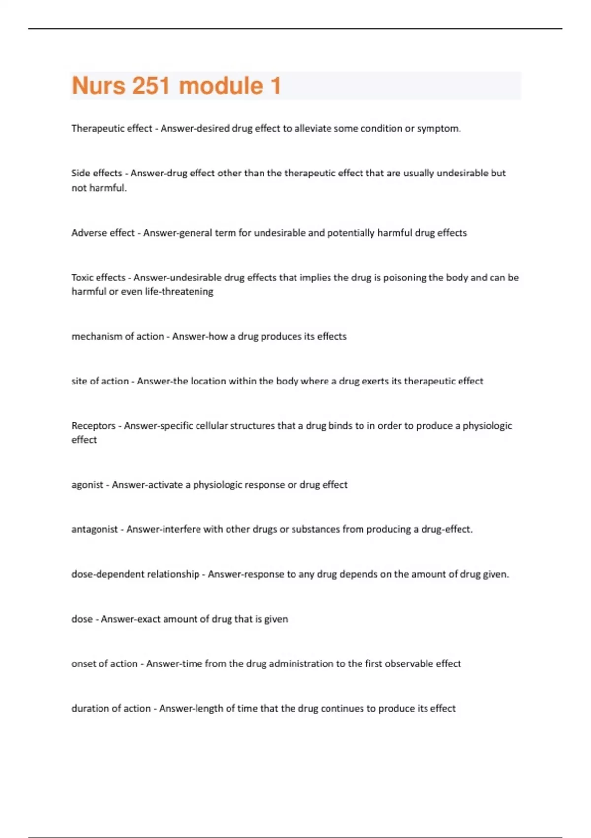 Therapeutic effect - Answer-desired drug effect to alleviate some condition or symptom. Side effects - Answer-drug effect other than the therapeutic effect that are usually undesirable but not harmful. Adverse effect - Answer-general term for undesirable and potentially harmful drug effects Toxic effects - Answer-undesirable drug effects that implies the drug is poisoning the body and can be harmful or even life-threatening mechanism of action - Answer-how a drug produces its effects site of action - Answer-the location within the body where a drug exerts its therapeutic effect Receptors - Answer-specific cellular structures that a drug binds to in order to produce a physiologic effect agonist - Answer-activate a physiologic response or drug effect antagonist - Answer-interfere with other drugs or substances from producing a drug-effect. dose-dependent relationship - Answer-response to any drug depends on the amount of drug given. dose - Answer-exact amount of drug that is given onset of action - Answer-time from the drug administration to the first observable effect duration of action - Answer-length of time that the drug continues to produce its effecttherapeutic range - Answer-when the drug concentration is above the minimum effective concentration and below the maximum tolerate concentration Routes of administration - Answer-how the drug is introduced to the body Oral administration - Answer-drug administration by way of the mouth through swallowing Parenteral administration - Answer-drug administration that does not involve the GI tract. Pharmaceutics - Answer-study of how various dosage forms influence the way in which the drug affects the body. Pharmacokinetics - Answer-study of what the body does to the drug, including absorption, distribution, metabolism, and excretion Pharmacodynamics - Answer-study of what the drug does to the body Pharmaceutics 2 - Answer-manipulating a chemical compound into something that can be administered to (or taken by) a patient as well as reach the targeted site of action in the body in order to exert its effect Absorption - Answer-movement of a drug from its site of administration into the bloodstream ready to be distributed throughout the body Bioavailability - Answer-measure of the extent of drug absorption for a given drug and route (from 0%-100% enteral administration - Answer-meaning the drug is absorbed through the GI tract, the drug is absorbed into circulation via the stomach and/or intestines Intravenous injection - Answer-escribes drugs that are injected directly to the bloodstream where it can then be distributed throughout the body intramuscular - Answer-directly into the muscle