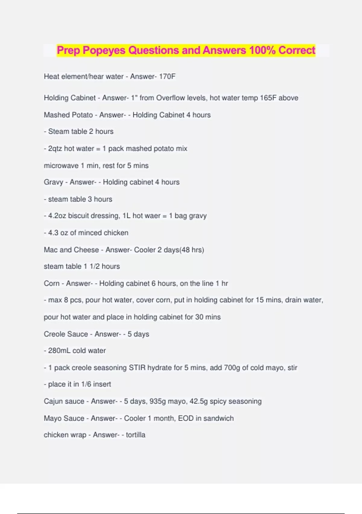 Prep Popeyes Questions and Answers 100% Correct Heat element/hear water - Answer- 170F Holding Cabinet - Answer- 1" from Overflow levels, hot water temp 165F above Mashed Potato - Answer- - Holding Cabinet 4 hours - Steam table 2 hours - 2qtz hot water = 1 pack mashed potato mix microwave 1 min, rest for 5 mins Gravy - Answer- - Holding cabinet 4 hours - steam table 3 hours - 4.2oz biscuit dressing, 1L hot waer = 1 bag gravy - 4.3 oz of minced chicken Mac and Cheese - Answer- Cooler 2 days(48 hrs) steam table 1 1/2 hours Corn - Answer- - Holding cabinet 6 hours, on the line 1 hr - max 8 pcs, pour hot water, cover corn, put in holding cabinet for 15 mins, drain water, pour hot water and place in holding cabinet for 30 mins Creole Sauce - Answer- - 5 days - 280mL cold water - 1 pack creole seasoning STIR hydrate for 5 mins, add 700g of cold mayo, stir - place it in 1/6 insert Cajun sauce - Answer- - 5 days, 935g mayo, 42.5g spicy seasoning Mayo Sauce - Answer- - Cooler 1 month, EOD in sandwich chicken wrap - Answer- - tortilla