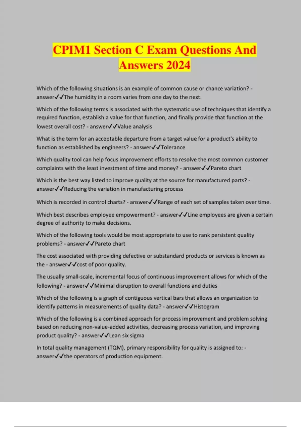 CPIM1 Section C Exam Questions And Answers 2024 Which of the following situations is an example of common cause or chance variation? - answerThe humidity in a room varies from one day to the next. Which of the following terms is associated with the systematic use of techniques that identify a required function, establish a value for that function, and finally provide that function at the lowest overall cost? - answerValue analysis What is the term for an acceptable departure from a target value for a product's ability to function as established by engineers? - answerTolerance Which quality tool can help focus improvement efforts to resolve the most common customer complaints with the least investment of time and money? - answerPareto chart Which is the best way listed to improve quality at the source for manufactured parts? - answerReducing the variation in manufacturing process Which is recorded in control charts? - answerRange of each set of samples taken over time. Which best describes employee empowerment? - answerLine employees are given a certain degree of authority to make decisions. Which of the following tools would be most appropriate to use to rank persistent quality problems? - answerPareto chart The cost associated with providing defective or substandard products or services is known as the - answercost of poor quality. The usually small-scale, incremental focus of continuous improvement allows for which of the following? - answerMinimal disruption to overall functions and duties Which of the following is a graph of contiguous vertical bars that allows an organization to identify patterns in measurements of quality data? - answerHistogram Which of the following is a combined approach for process improvement and problem solving based on reducing non-value-added activities, decreasing process variation, and improving product quality? - answerLean six sigma In total quality management (TQM), primary responsibility for quality is assigned to: - answerthe operators of production equipment. A fishbone diagram most often is used to identify: - answera cause. Which is a good description of the purpose of a fishbone diagram? - answerMethod to determine the root cause of a symptom. A process has four steps in which each has a yield of 99.7 percent (within 3 sigmas or standard deviations) or a 0.3 percent chance of defective material. What is the probability of a defect for the final finished good? - answer1.195 percent Which often has the advantages of providing better response to customer wishes, lowering cost, speeding decision making, and helping to get people who are directly aware of problems more involved in solving them? - answerAllowing people further down the management structure to make decisions indepen