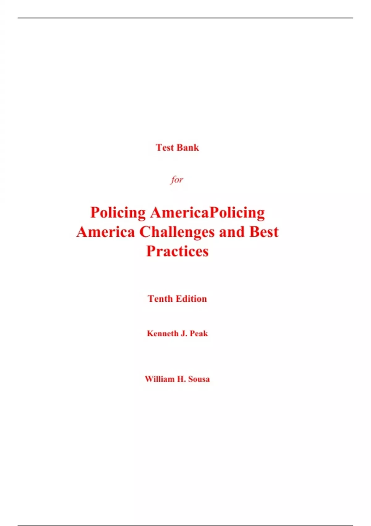Test Bank for Policing America Challenges and Best Practices 10th Edition By Kenneth Peak, William Sousa (All Chapters, 100% Original Verified, A+ Grade)