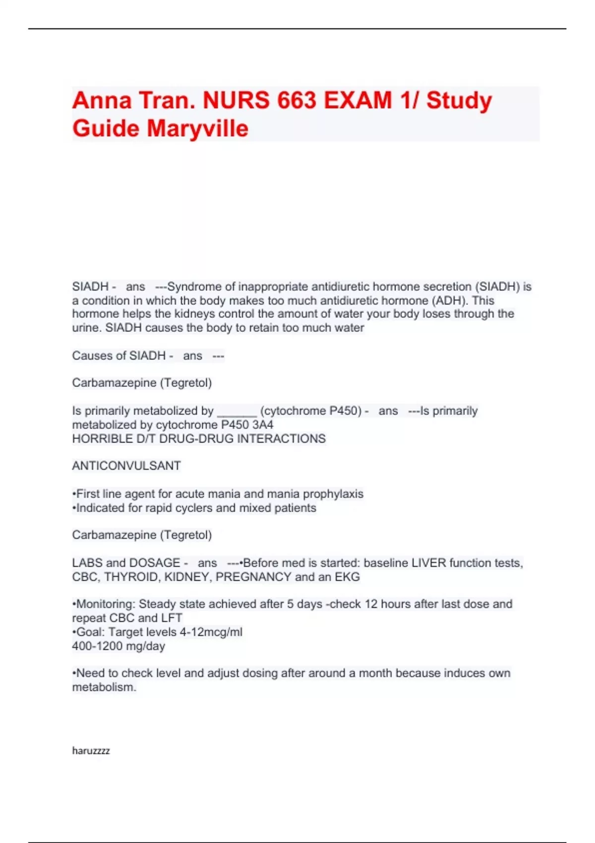 SIADH - ans ---Syndrome of inappropriate antidiuretic hormone secretion (SIADH) is a condition in which the body makes too much antidiuretic hormone (ADH). This hormone helps the kidneys control the amount of water your body loses through the urine. SIADH causes the body to retain too much water Causes of SIADH - ans --- Carbamazepine (Tegretol) Is primarily metabolized by ______ (cytochrome P450) - ans ---Is primarily metabolized by cytochrome P450 3A4 HORRIBLE D/T DRUG-DRUG INTERACTIONS ANTICONVULSANT •First line agent for acute mania and mania prophylaxis •Indicated for rapid cyclers and mixed patients Carbamazepine (Tegretol) LABS and DOSAGE - ans ---•Before med is started: baseline LIVER function tests, CBC, THYROID, KIDNEY, PREGNANCY and an EKG •Monitoring: Steady state achieved after 5 days -check 12 hours after last dose and repeat CBC and LFT •Goal: Target levels 4-12mcg/ml 400-1200 mg/day •Need to check level and adjust dosing after around a month because induces own metabolism.
