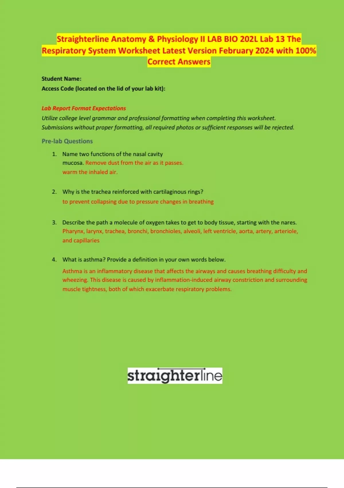 Straighterline Anatomy & Physiology II LAB BIO 202L Lab 13 The Respiratory System Worksheet Latest Version February 2024 with 100% Correct Answers
