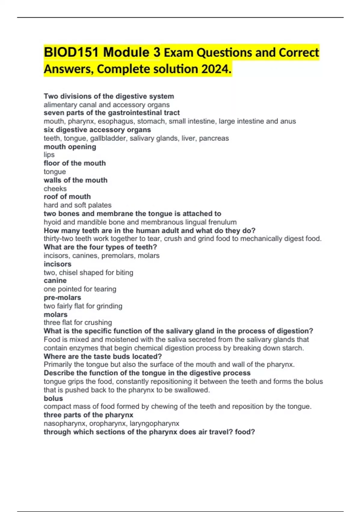 BIOD151 Module 3 Exam Questions and Correct Answers, Complete solution 2024. Two divisions of the digestive system alimentary canal and accessory organs seven parts of the gastrointestinal tract mouth, pharynx, esophagus, stomach, small intestine, large intestine and anus six digestive accessory organs teeth, tongue, gallbladder, salivary glands, liver, pancreas mouth opening lips floor of the mouth tongue walls of the mouth cheeks roof of mouth hard and soft palates two bones and membrane the tongue is attached to hyoid and mandible bone and membranous lingual frenulum How many teeth are in the human adult and what do they do? thirty-two teeth work together to tear, crush and grind food to mechanically digest food. What are the four types of teeth? incisors, canines, premolars, molars incisors two, chisel shaped for biting canine one pointed for tearing pre-molars two fairly flat for grinding molars three flat for crushing What is the specific function of the salivary gland in the process of digestion? Food is mixed and moistened with the saliva secreted from the salivary glands that contain enzymes that begin chemical digestion process by breaking down starch. Where are the taste buds located? Primarily the tongue but also the surface of the mouth and wall of the pharynx. Describe the function of the tongue in the digestive process tongue grips the food, constantly repositioning it between the teeth and forms the bolus that is pushed back to the pharynx to be swallowed. bolus compact mass of food formed by chewing of the teeth and reposition by the tongue. three parts of the pharynx nasopharynx, oropharynx, laryngopharynx through which sections of the pharynx does air travel? food?
