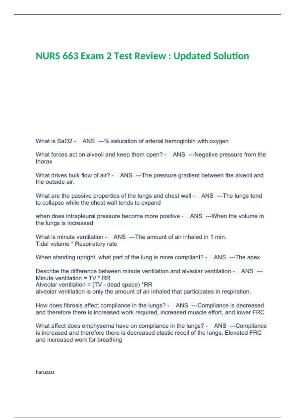 What is SaO2 - ANS ---% saturation of arterial hemoglobin with oxygen What forces act on alveoli and keep them open? - ANS ---Negative pressure from the thorax What drives bulk flow of air? - ANS ---The pressure gradient between the alveoli and the outside air. What are the passive properties of the lungs and chest wall - ANS ---The lungs tend to collapse while the chest wall tends to expand when does intrapleural pressure become more positive - ANS ---When the volume in the lungs is increased What is minute ventilation - ANS ---The amount of air inhaled in 1 min. Tidal volume * Respiratory rate When standing upright, what part of the lung is more compliant? - ANS ---The apex Describe the difference between minute ventilation and alveolar ventilation - ANS ---Minute ventilation = TV * RR Alveolar ventilation = (TV - dead space) *RR alveolar ventilation is only the amount of air inhaled that participates in respiration. How does fibrosis affect compliance in the lungs? - ANS ---Compliance is decreased and therefore there is increased work required, increased muscle effort, and lower FRC What affect does emphysema have on compliance in the lungs? - ANS ---Compliance is increased and therefore there is decreased elastic recoil of the lungs, Elevated FRC and increased work for breathing