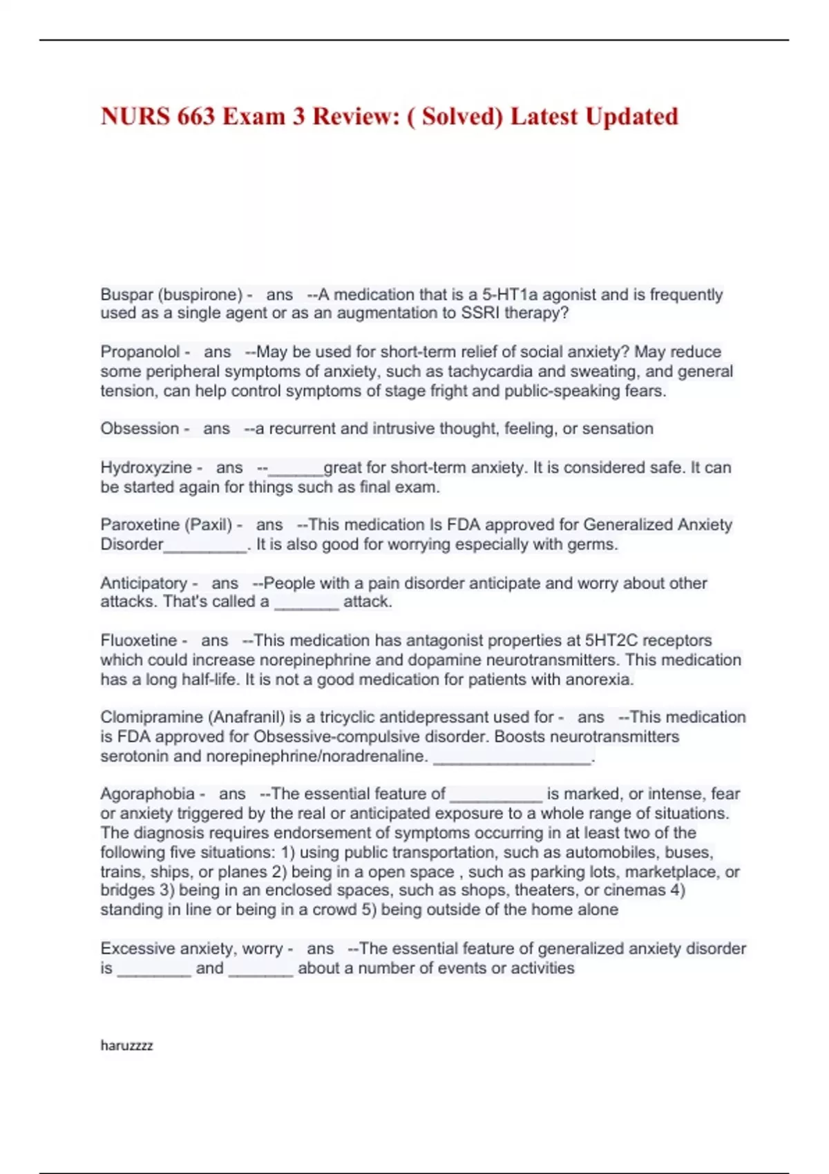 Buspar (buspirone) - ans --A medication that is a 5-HT1a agonist and is frequently used as a single agent or as an augmentation to SSRI therapy? Propanolol - ans --May be used for short-term relief of social anxiety? May reduce some peripheral symptoms of anxiety, such as tachycardia and sweating, and general tension, can help control symptoms of stage fright and public-speaking fears. Obsession - ans --a recurrent and intrusive thought, feeling, or sensation Hydroxyzine - ans --______great for short-term anxiety. It is considered safe. It can be started again for things such as final exam. Paroxetine (Paxil) - ans --This medication Is FDA approved for Generalized Anxiety Disorder_________. It is also good for worrying especially with germs. Anticipatory - ans --People with a pain disorder anticipate and worry about other attacks. That's called a _______ attack. Fluoxetine - ans --This medication has antagonist properties at 5HT2C receptors which could increase norepinephrine and dopamine neurotransmitters. This medication has a long half-life. It is not a good medication for patients with anorexia. Clomipramine (Anafranil) is a tricyclic antidepressant used for - ans --This medication is FDA approved for Obsessive-compulsive disorder. Boosts neurotransmitters serotonin and norepinephrine/noradrenaline. _________________. Agoraphobia - ans --The essential feature of __________ is marked, or intense, fear or anxiety triggered by the real or anticipated exposure to a whole range of situations. The diagnosis requires endorsement of symptoms occurring in at least two of the following five situations: 1) using public transportation, such as automobiles, buses, trains, ships, or planes 2) being in a open space , such as parking lots, marketplace, or bridges 3) being in an enclosed spaces, such as shops, theaters, or cinemas 4) standing in line or being in a crowd 5) being outside of the home alone Excessive anxiety, worry - ans --The essential feature of generalized anxiety disorder is ________ and _______ about a number of events or activities