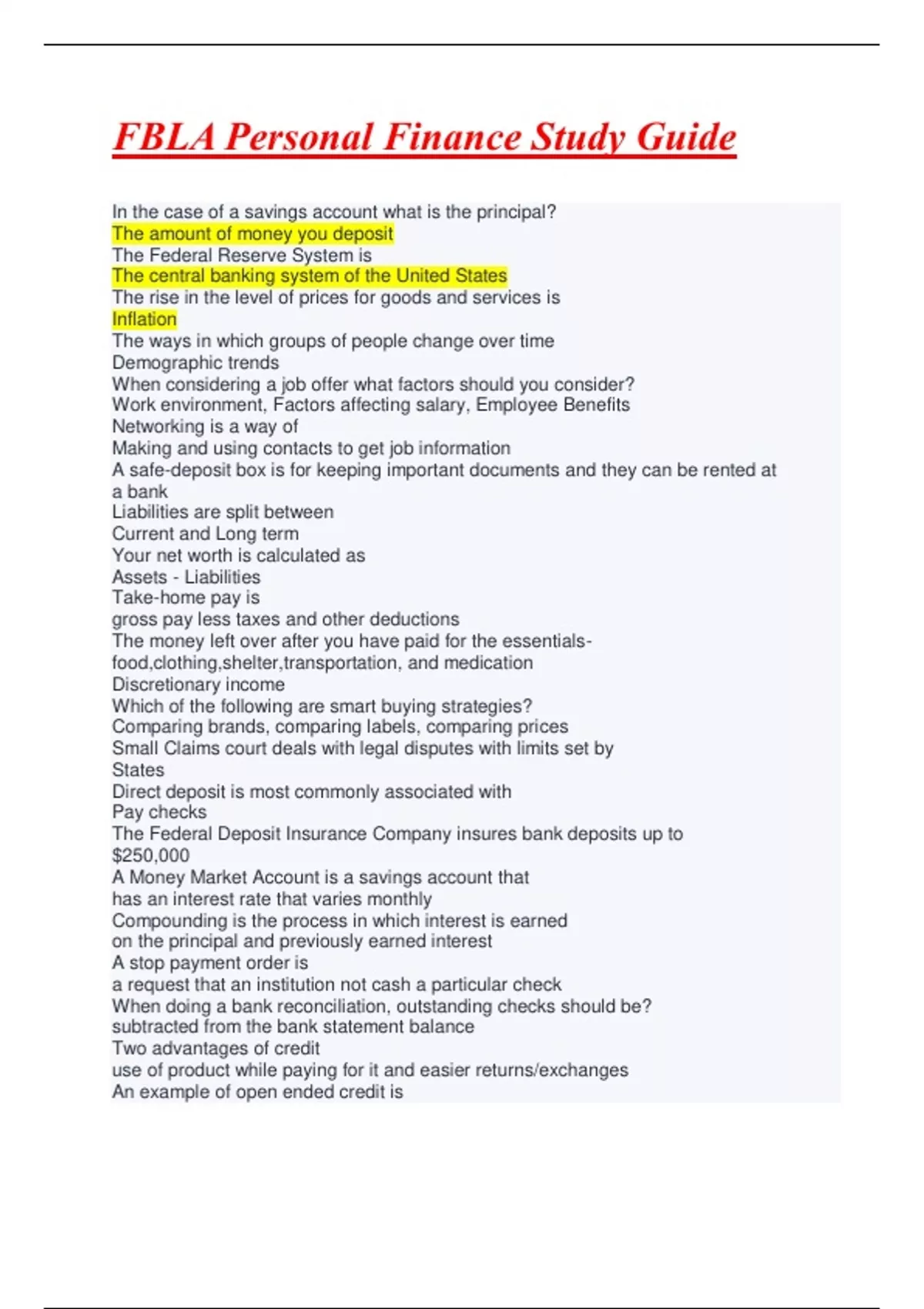 - FBLA Personal Finance