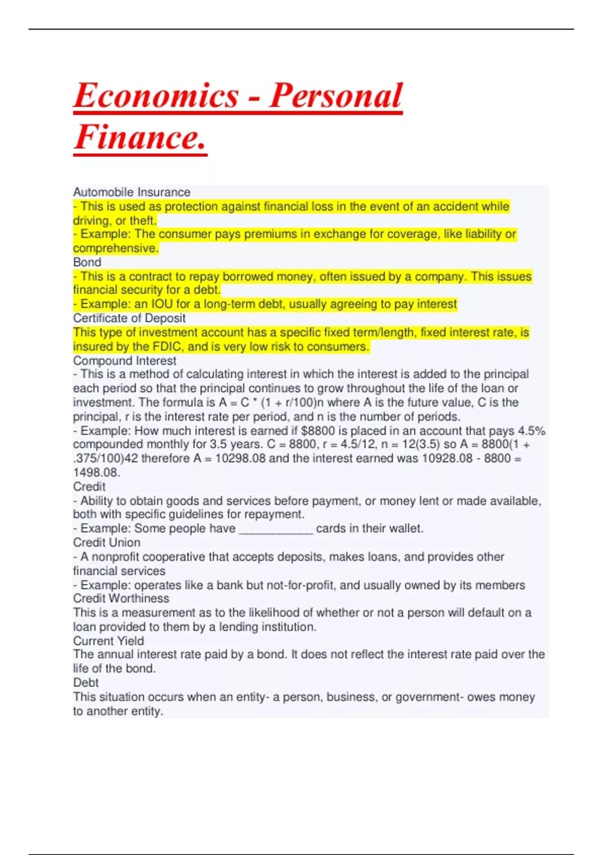 - Ability to obtain goods and services before payment, or money lent or made available, both with specific guidelines for repayment. - Example: Some people have ___________ cards in their wallet. Credit Union - A nonprofit cooperative that accepts deposits, makes loans, and provides other financial services - Example: operates like a bank but not-for-profit, and usually owned by its members Credit Worthiness This is a measurement as to the likelihood of whether or not a person will default on a loan provided to them by a lending institution. Current Yield The annual interest rate paid by a bond. It does not reflect the interest rate paid over the life of the bond. Debt This situation occurs when an entity- a person, business, or government- owes money to another entity