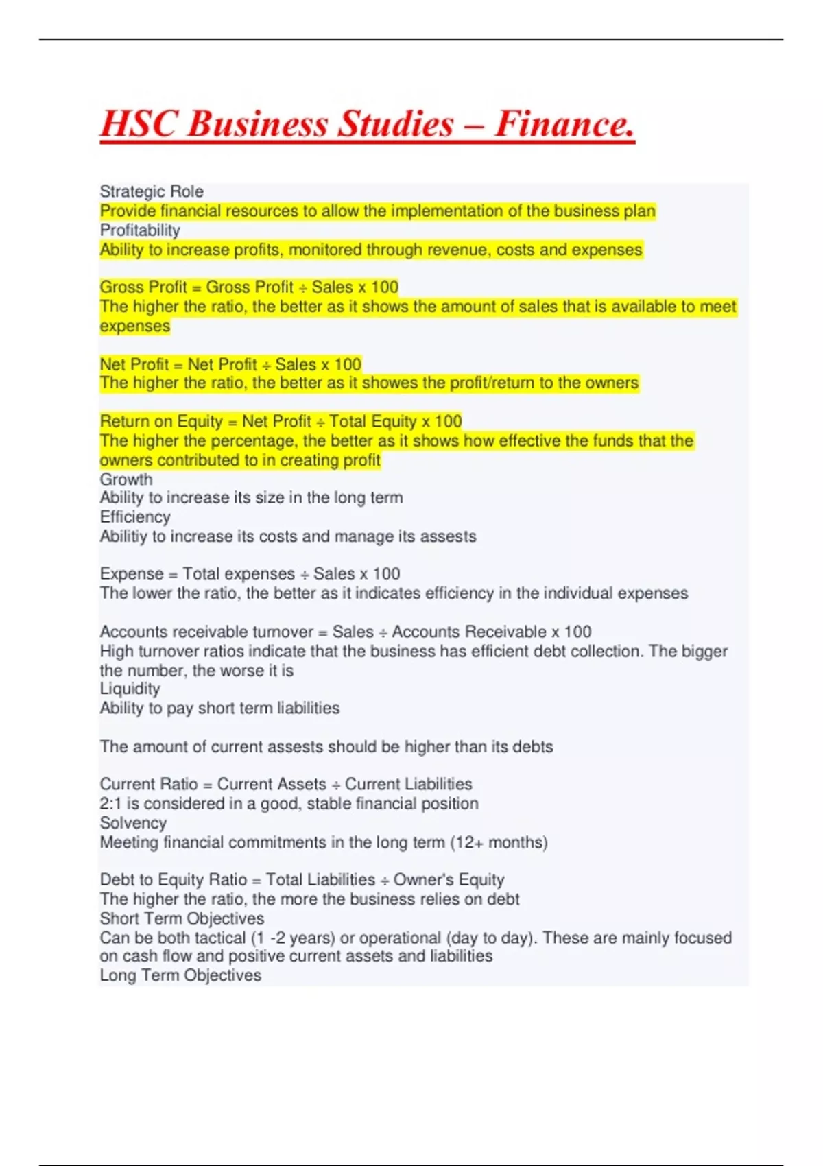 The lower the ratio, the better as it indicates efficiency in the individual expenses Accounts receivable turnover = Sales ÷ Accounts Receivable x 100 High turnover ratios indicate that the business has efficient debt collection. The bigger the number, the worse it is Liquidity Ability to pay short term liabilities The amount of current assests should be higher than its debts Current Ratio = Current Assets ÷ Current Liabilities 2:1 is considered in a good, stable financial position Solvency Meeting financial commitments in the long term (12+ months) Debt to Equity Ratio = Total Liabilities ÷ Owner's Equity The higher the ratio, the more the business relies on debt Short Term Objectives Can be both tactical (1 -2 years) or operational (day to day). These are mainly focused on cash flow and positive current assets and liabilities Long Term Objectives