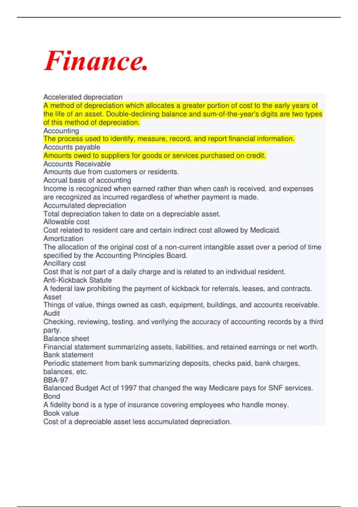 Accrual basis of accounting Income is recognized when earned rather than when cash is received, and expenses are recognized as incurred regardless of whether payment is made. Accumulated depreciation Total depreciation taken to date on a depreciable asset. Allowable cost Cost related to resident care and certain indirect cost allowed by Medicaid. Amortization The allocation of the original cost of a non-current intangible asset over a period of time specified by the Accounting Principles Board. Ancillary cost Cost that is not part of a daily charge and is related to an individual resident. Anti-Kickback Statute