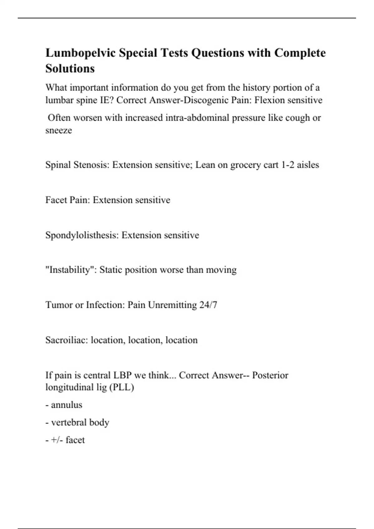 Lumbopelvic Special Tests Questions with Complete Solutions